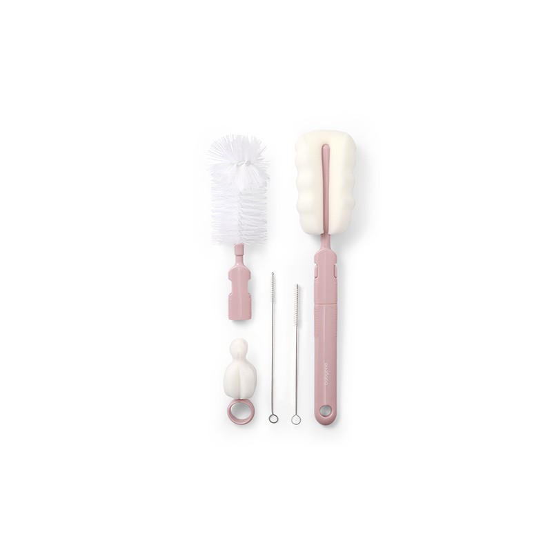 Znajdziesz tu dwie wymienne końcówki do mycia butelek, kubków i bidonów- szczotkę z miękkim włosiem i elastyczną gąbkę. Do zestawu dołączyliśmy małą gąbkę do czyszczenia smoczków oraz dwie mini szczoteczki do mycia słomek i rurek.