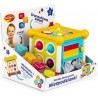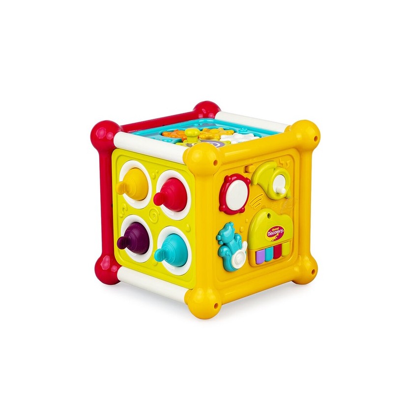 Znajdziemy tu trybiki do kręcenia, żaluzje do odsłaniania, zasłonki do rozsuwania, elementy do wciskania i wyciągania, sznureczki do przekładania klocków, dołączonych do zestawu, oraz ściankę muzyczną, na której znajdują się kształty instrumentów muzycznych, a umieszczone w nich przyciski uruchamiają dźwięki i melodie. W kostce kryje się też niespodzianka, w postaci ruchomej ścianki, której odchylenie umożliwia wygodne wyjmowanie włożonych wcześniej do kostki klocków.