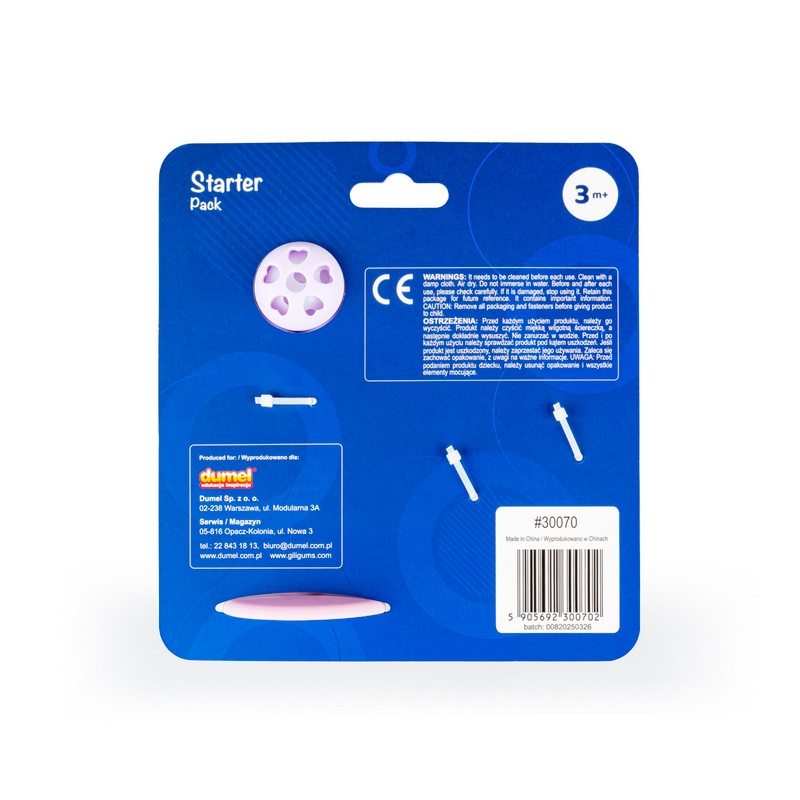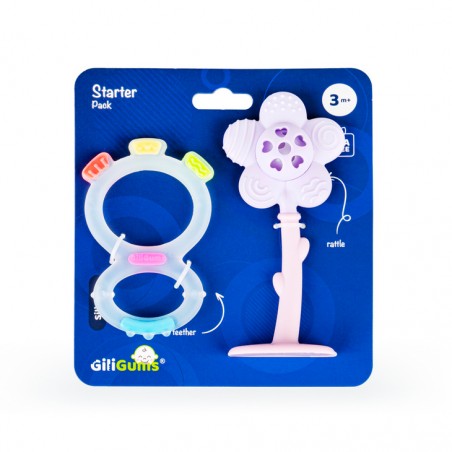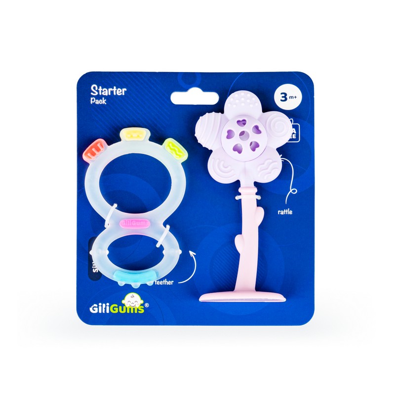 Pastelowo i uroczo witamy na świecie! Pierwszy zestaw dla maluszka składa się z dwóch praktycznych zabawek: gryzaka Ósemki oraz Radosnego Kwiatka w kolorze fioletowym.