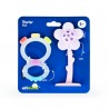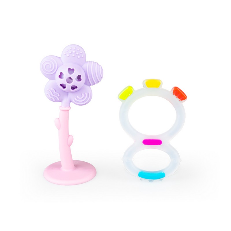 – w zestawie 2 zabawki: gryzak Ósemka i grzechotka Radosny Kwiatek fioletowy;