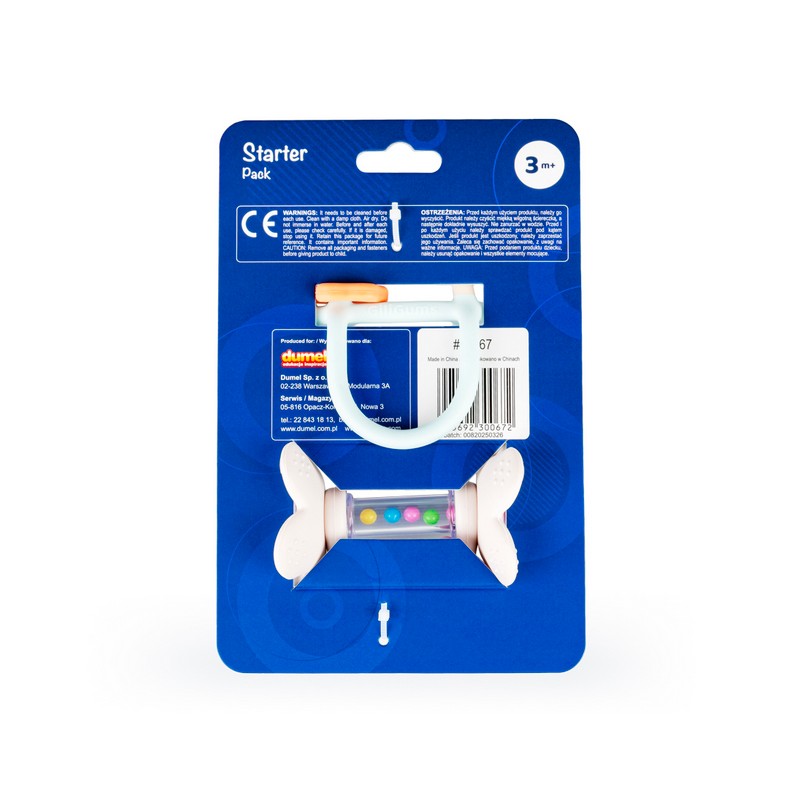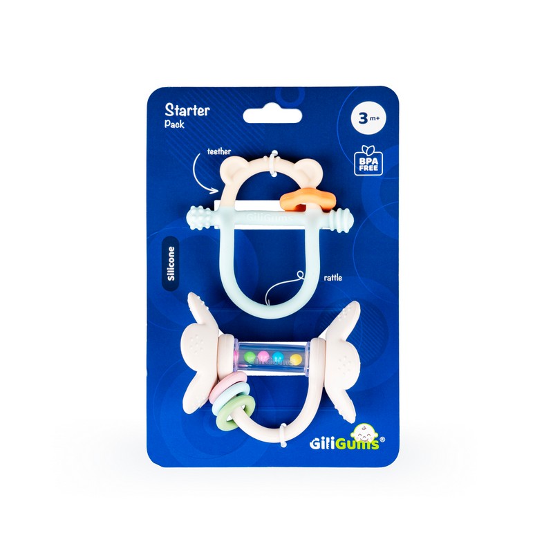 Ten uroczy zestaw składa się z dwóch przydatnych produktów: gryzaczka, którego konstrukcja ułatwia chwytanie zabawki małymi rączkami oraz grzechotki wyposażonej w ruchome pierścienie. Obie zabawki posiadają wypustki, które podczas gryzienia delikatnie masują podrażnione ząbkowanie dziąsełka bobasa. Zestaw wspaniale sprawdzi się w charakterze prezentu dla maluszka.