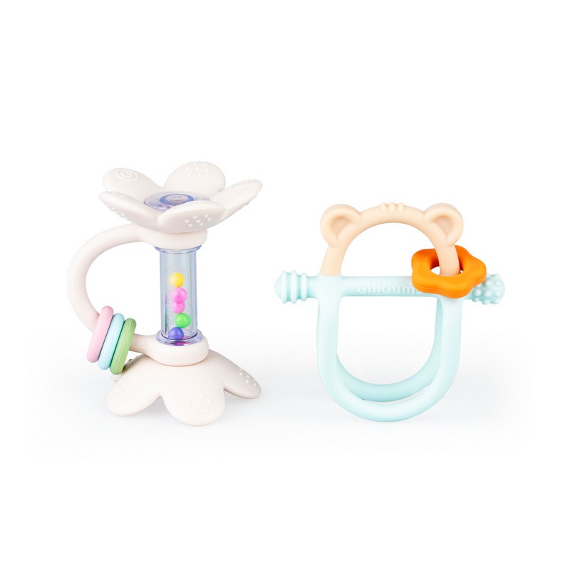 – w zestawie 2 zabawki: gryzak Miś i grzechotka Grzechoczące Kwiatki pastelowe;