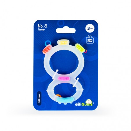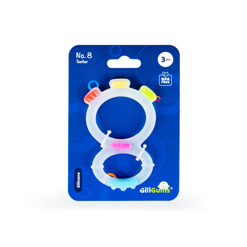 Ten zabawny gryzaczek wykonany został z silikonu, dzięki czemu bez trudu go wyczyścisz, aby zapewnić maluszkowi higienę, podczas korzystania z zabawki. Kształt Ósemki dopasowany jest do małych rączek, co ułatwi maluchowi chwytanie gryzaka.