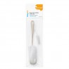 Długa szczotka zakończona miękką gąbką sięga aż do dna butelki, a malutka szczoteczka precyzyjnie usuwa resztki pokarmu ze smoczka. Odpowiednio wyprofilowane końcówki docierają do wszystkich zakamarków.