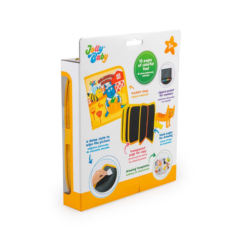 Zapinana książeczka kryje w sobie zmazywalne strony – czarne, do samodzielnego ozdabiania oraz przezroczystą kartę do odrysowywania dołączonych szablonów z wiejskimi zwierzątkami. W zestawie znajdziemy także 12 kolorowych mazaków oraz wilgotną ściereczkę do zmazania wcześniej narysowanych obrazków.