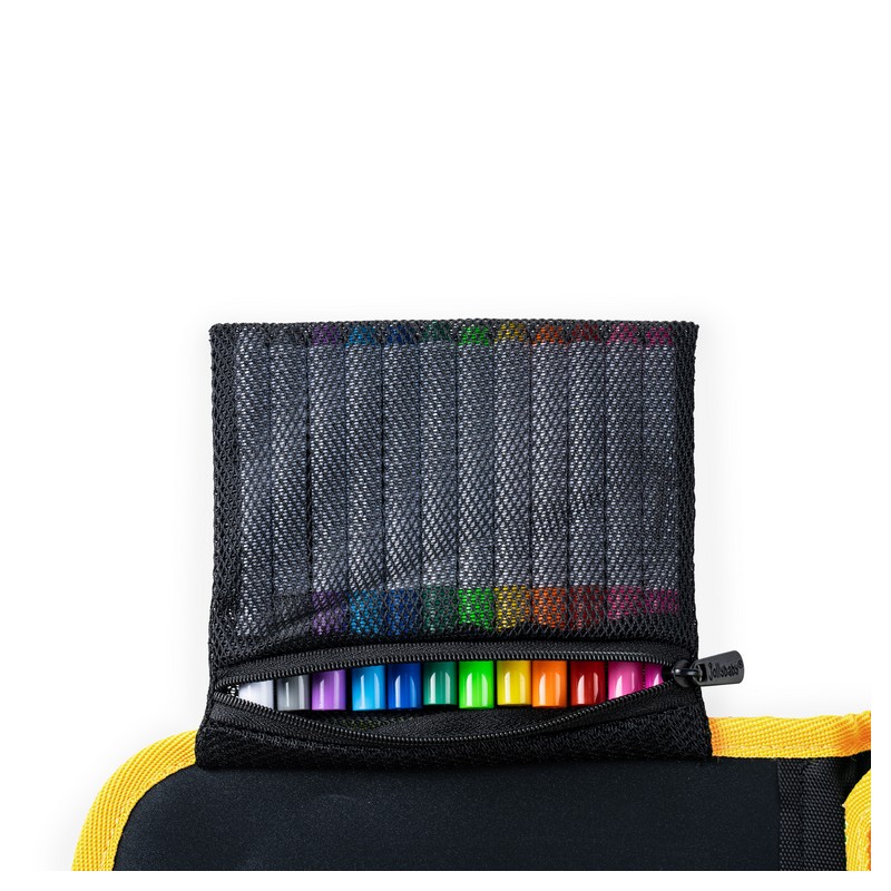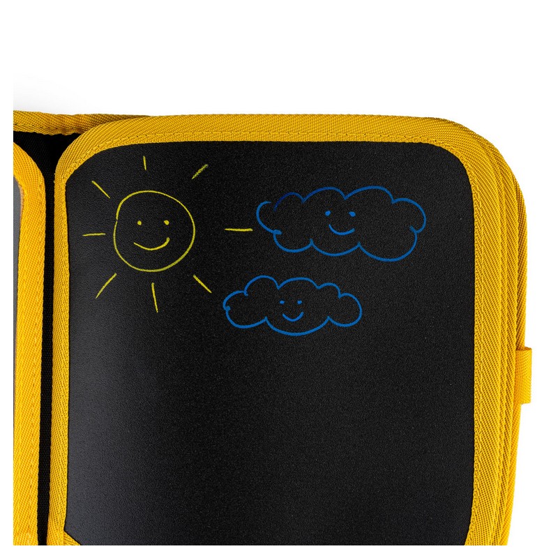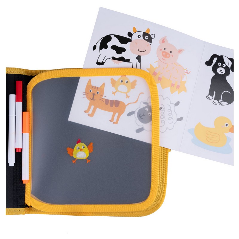 – wewnątrz książeczki znajdują się czarne strony do rysowania i 1 przezroczysta karta do odrysowywania szablonów (wiejskie zwierzątka) oraz zapinana kieszonka na mazaki;
