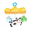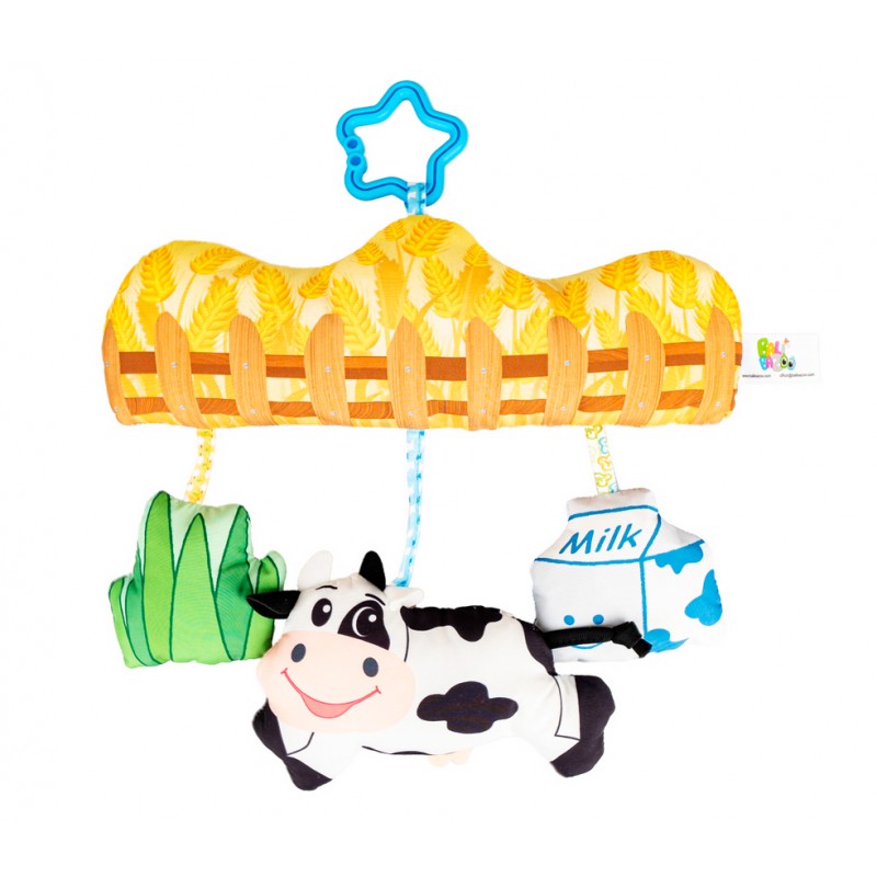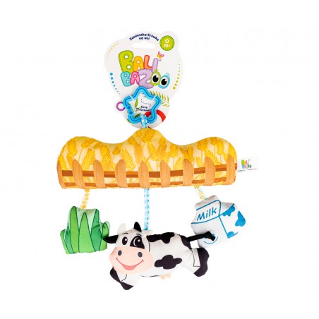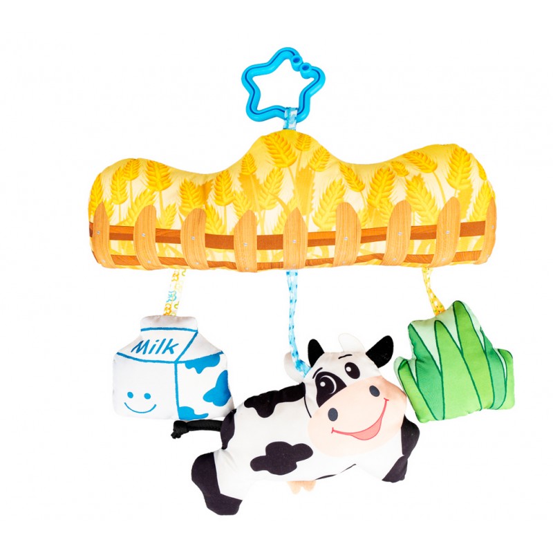 Znajdziemy tu, poza górnym panelem, ozdobionym kłosami pszenicy i płotkiem, krówkę, karton mleka oraz kępkę trawy. Wybrane elementy zabawiają na różne sposoby, dzwoniąc, grzechocząc lub piszcząc. Zabawka wyposażona jest w praktyczną zawieszkę, która pozwala na przymocowanie jej w dowolnym miejscu.