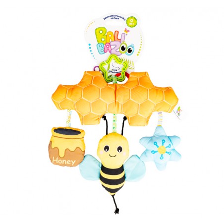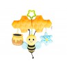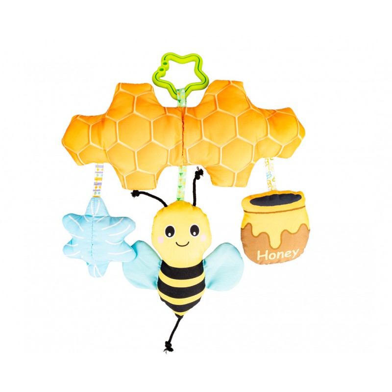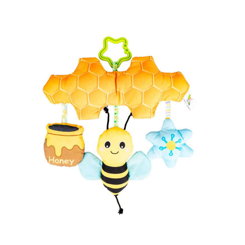 Na plastrze miodu, wyposażonym w kryty dzwoneczek, buja się, zabawnie popiskując, uśmiechnięta pszczółka. Towarzyszy jej szeleszcząca beczułka miodu i piszczący kwiatek. Zabawka posiada praktyczną zawieszkę w kształcie gwiazdki, która umożliwia przymocowanie jej w dowolnym miejscu.