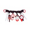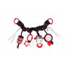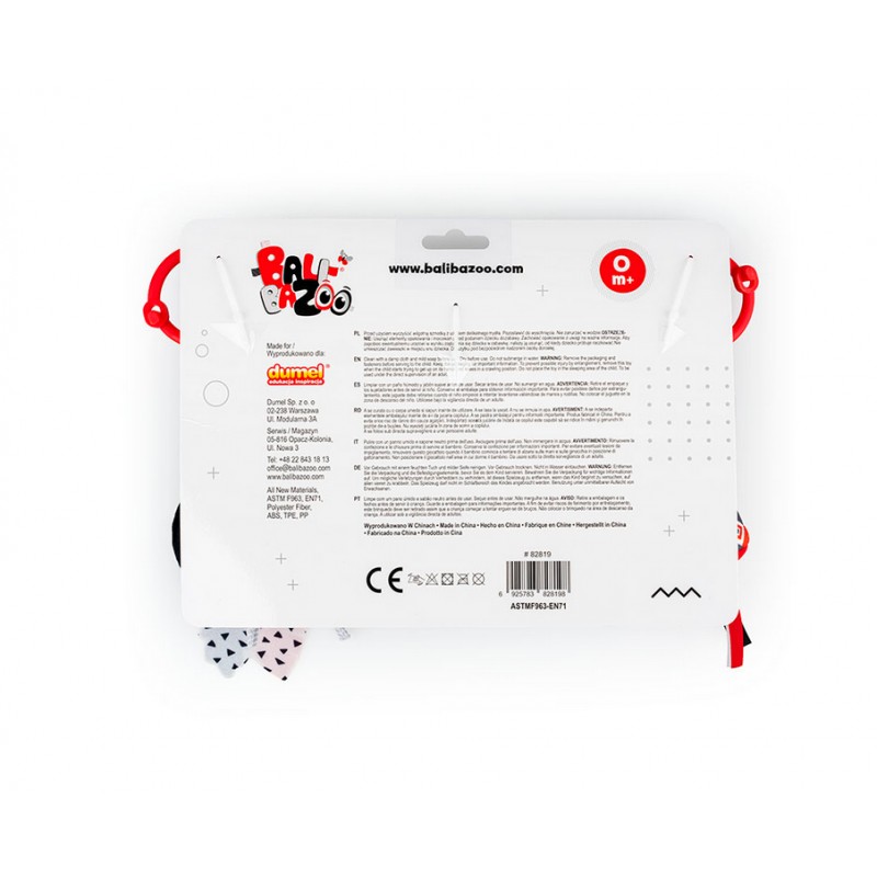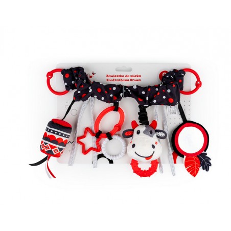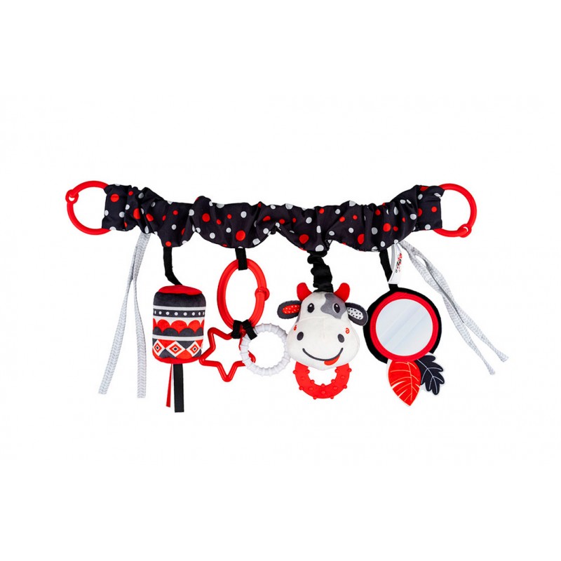 Ta praktyczna zawieszka, wyposażona w elastyczną taśmę, dwa rodzaje mocowań (zapinane kółka oraz wiązane tasiemki) i cztery różne zabawki, sprawdzi się zarówno w domu, jak i na spacerze. Znajdziemy tu bezpieczne lusterko do samopoznania dziecka, materiałową głowę krówki z gryzaczkiem, dzwoneczek, a także twarde kształty, zawieszone na odczepianym kółeczku. Zabawka wykonana została z kontrastowych materiałów o zróżnicowanych fakturach, co stymulować będzie zmysły bobasa, rozwijając prz tym jego zdolności poznawcze.
