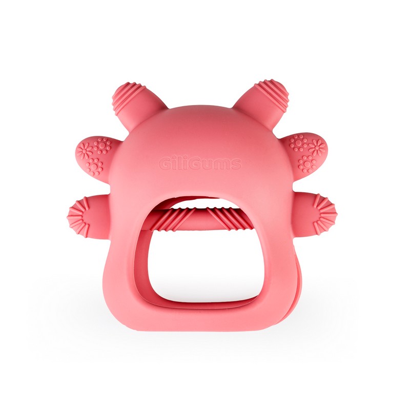 Ten uroczy gryzaczek posiada specjalną konstrukcję, pozwalającą na włożenie rączki do środka i złapanie go za poprzeczny, fakturowany uchwyt. Ta nieregularna powierzchnia zapobiega niekontrolowanemu wyślizgiwaniu się produktu z rączki dziecka. Gryzak posiada wypustki, które podczas gryzienia będą delikatnie masować podrażnione dziąsła maluszka, przynosząc mu ulgę w ząbkowaniu. Dzięki temu, iż zabawka wykonana jest z silikonu, bez trudu ją wyczyścisz.