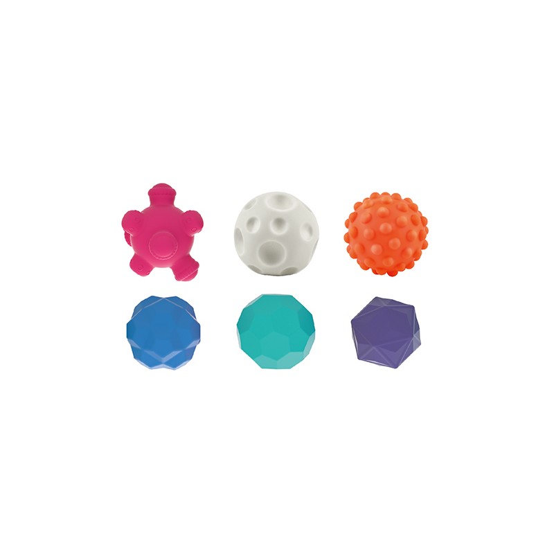 Każda piłeczka posiada inny kształt. Dziecko ma w ten sposób zapewnione różnorodne doznania poznawcze – od miękkich i gładkich, po wyraźnie strukturalne i nierówne powierzchnie.