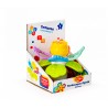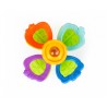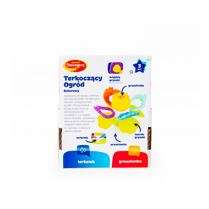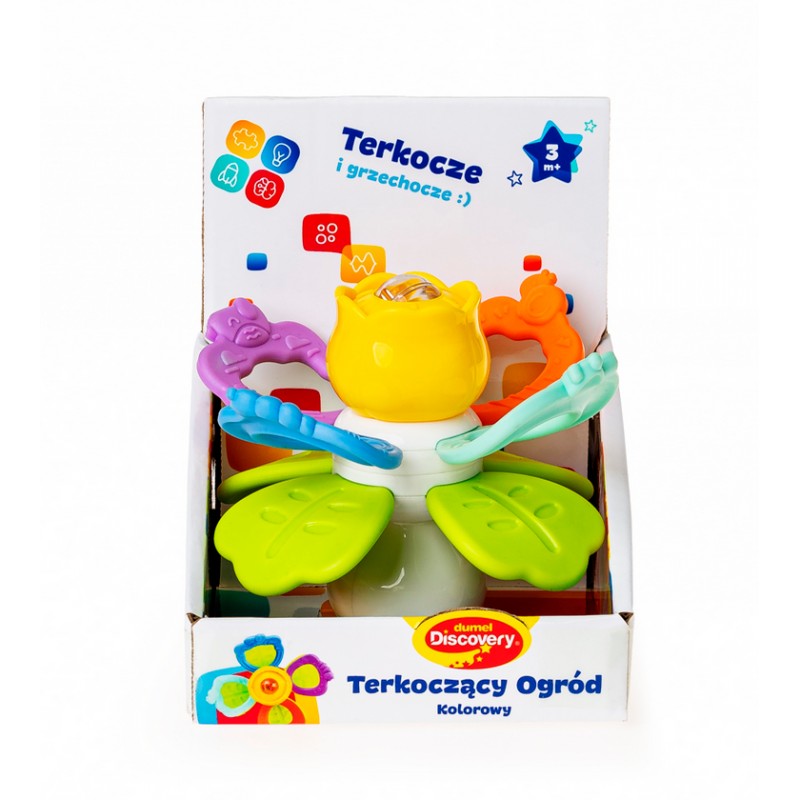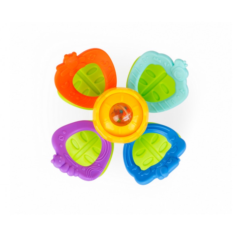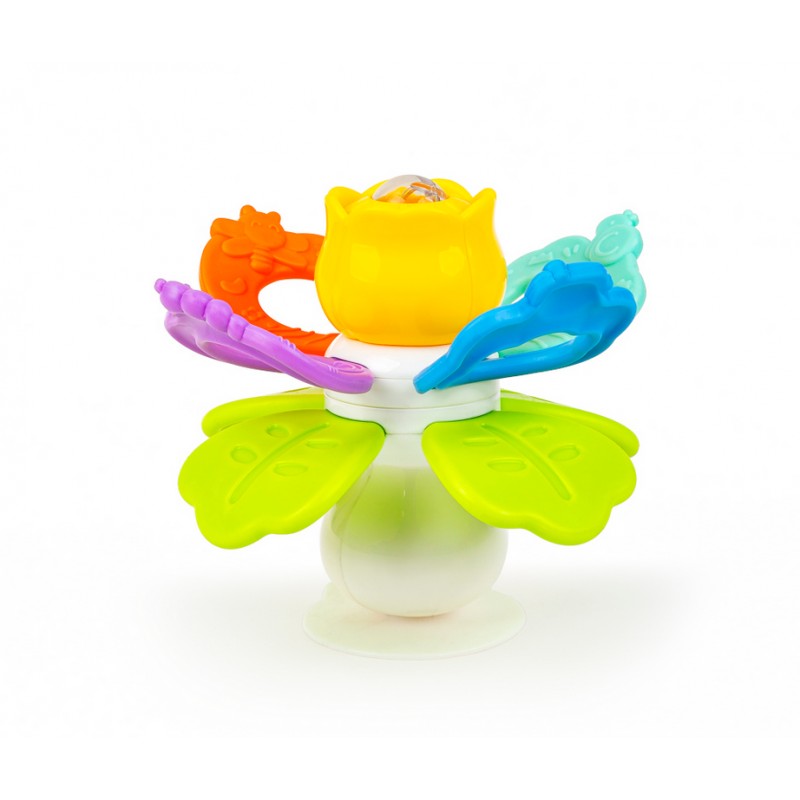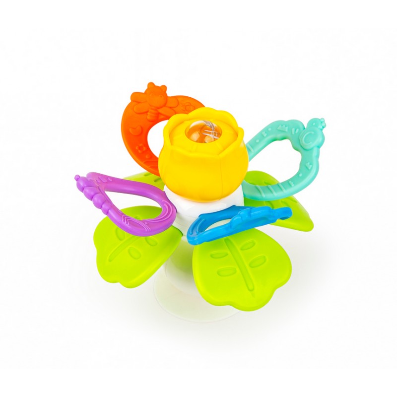 Zabawka składa się z miękkich oraz twardych gryzaków, kwiatka z ukrytą w jego wnętrzu grzechotką, z wesołego terkotka, którego aktywuje przekręcanie względem siebie górnych i dolnych gryzaków, oraz z praktycznej przyssawki. Dzięki niej przymocujesz zabaweczkę do dowolnej, czystej, płaskiej i gładkiej powierzchni, aby zajęła maluszka wesołym przekręcaniem i grzechotaniem w konkretnym miejscu.