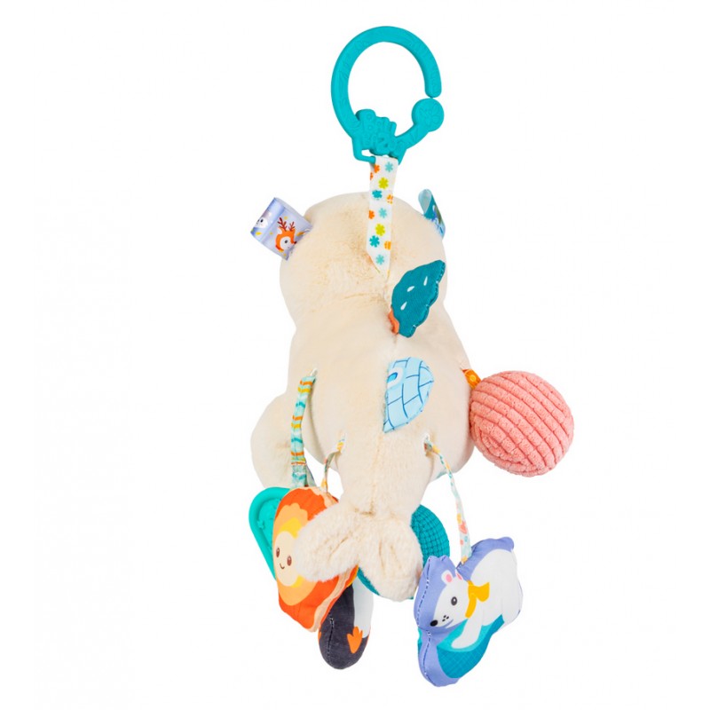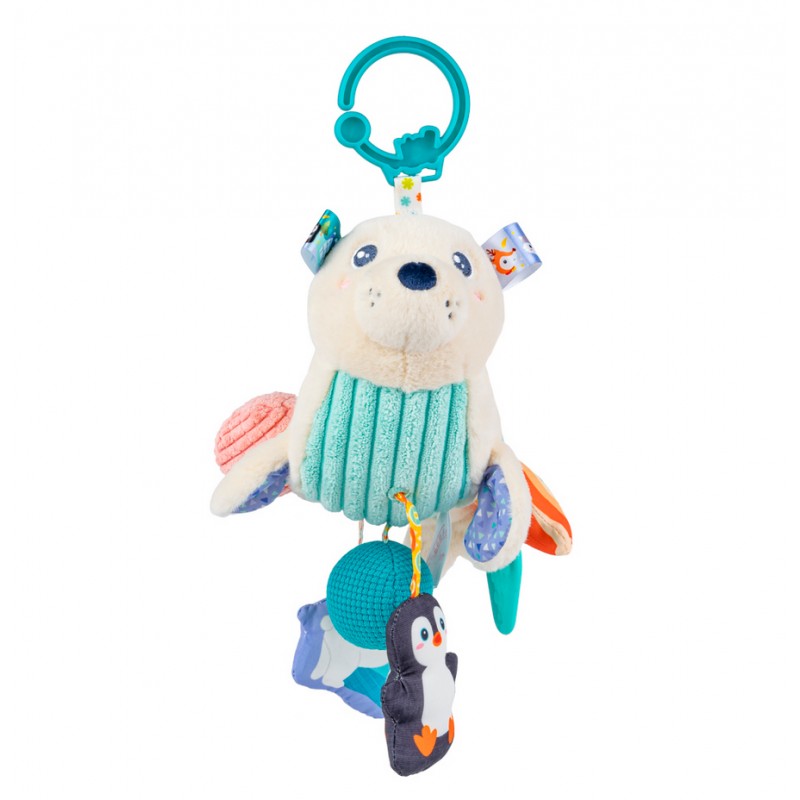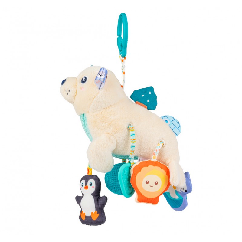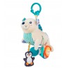 Jest tu bezpieczne lusterko do samopoznania bobasa, linki do przeciągania, materiałowy pingwinek i miś polarny, a także kolorowe metki z obrazkami. Milutkie futerko zachęca do przytulania zwierzaka, a zróżnicowane faktury zastosowanych w nim materiałów, zachęcą bobasa do rozwijania zdolności poznawczych. Zabawka wyposażona jest w praktyczną zawieszką, więc można ją przyczepić w dowolnym miejscu, aby towarzyszyła maluchowi w każdej sytuacji.