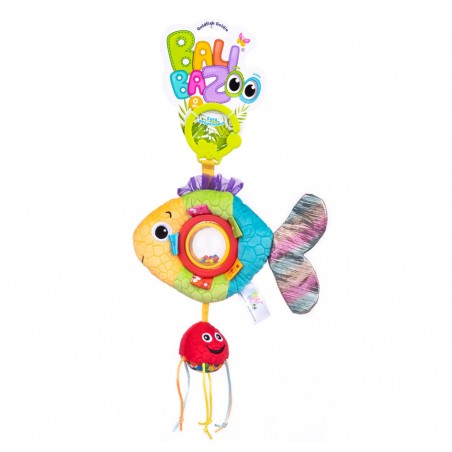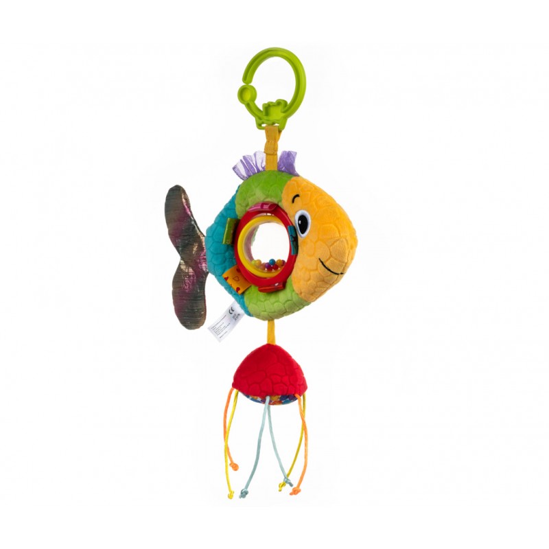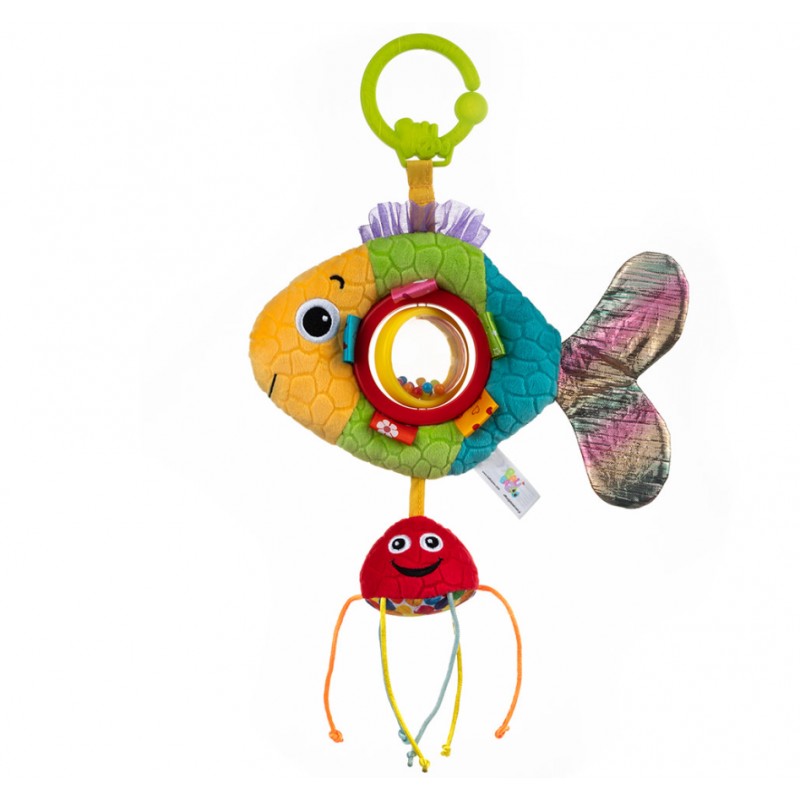 Rybka posiada w brzuszku magiczną kulę. Gdy maluszek nią zakręci, wprawi w ruch kolorowe, grzechoczące koraliki znajdujące się w jej wnętrzu! Rybka posiada także metki o zróżnicowanej fakturze, które pomogą najmłodszym rozwijać umiejętności poznawcze. Praktyczna klamra pozwoli przymocować zawieszkę w wybranym miejscu.