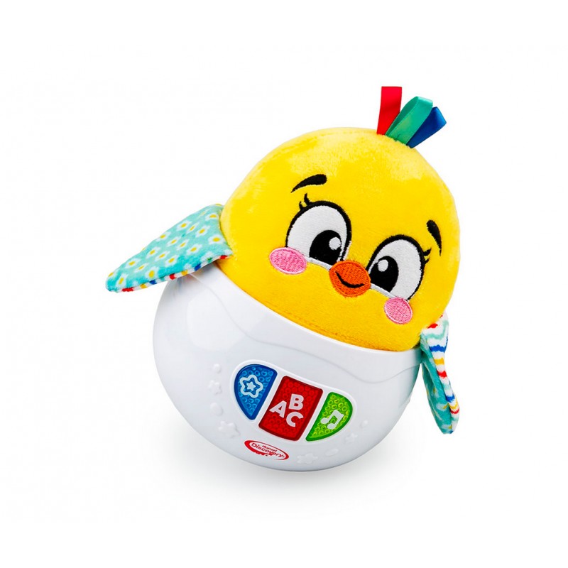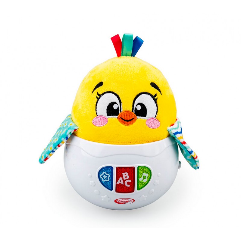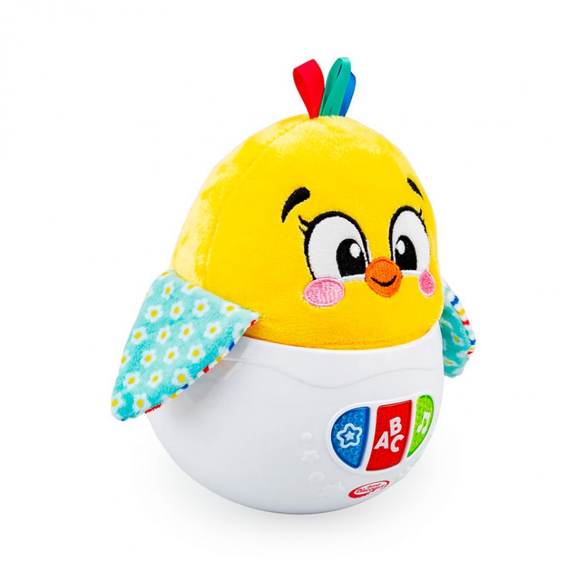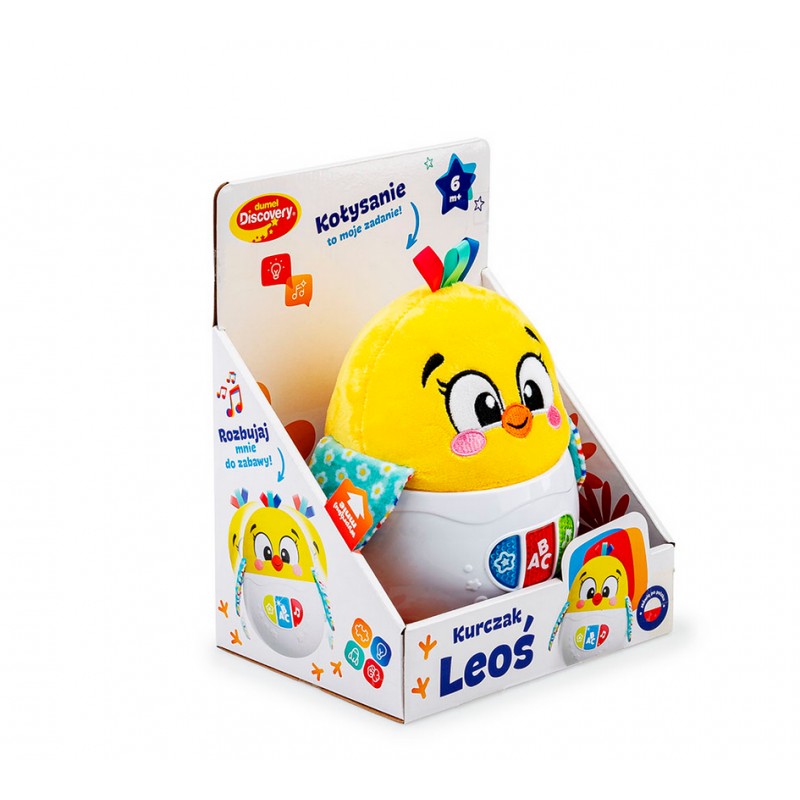 Uroczy kurczaczek w zabawkowej skorupce buja się wesoło, odtwarzając przy tym przeróżne dźwięki. Leoś zna kilka krótkich rymowanek oraz wesołe piosenki i melodie, a gdy maluch pchnie go do tyłu lub w bok, kurczaczek zakołysze się na podstawce i wróci do bazowej pozycji.