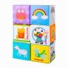 Klocuszki są kwadratowe z ciekawą grafiką, dzięki której maluszek pozna różne zwierzątka, owoce, przedmioty itp., a także nauczy się układać obrazki.