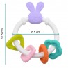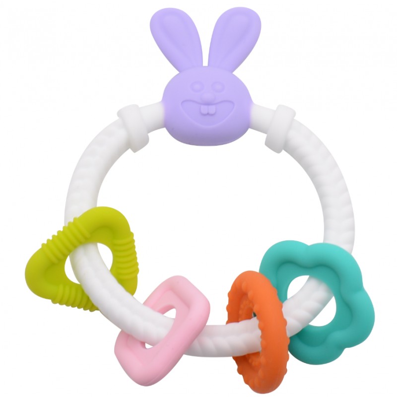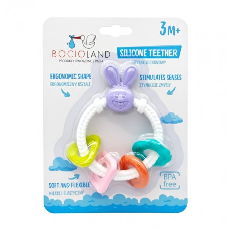 Centrum gryzaka stanowi fioletowa główka króliczka z długimi uszami, które idealnie nadają się do masowania dziąseł w tylnej części buzi. Biała, elastyczna obręcz posiada unikalną fakturę skręconego sznura, co zapewnia dodatkową stymulację sensoryczną przy każdym dotyku i gryzieniu.
