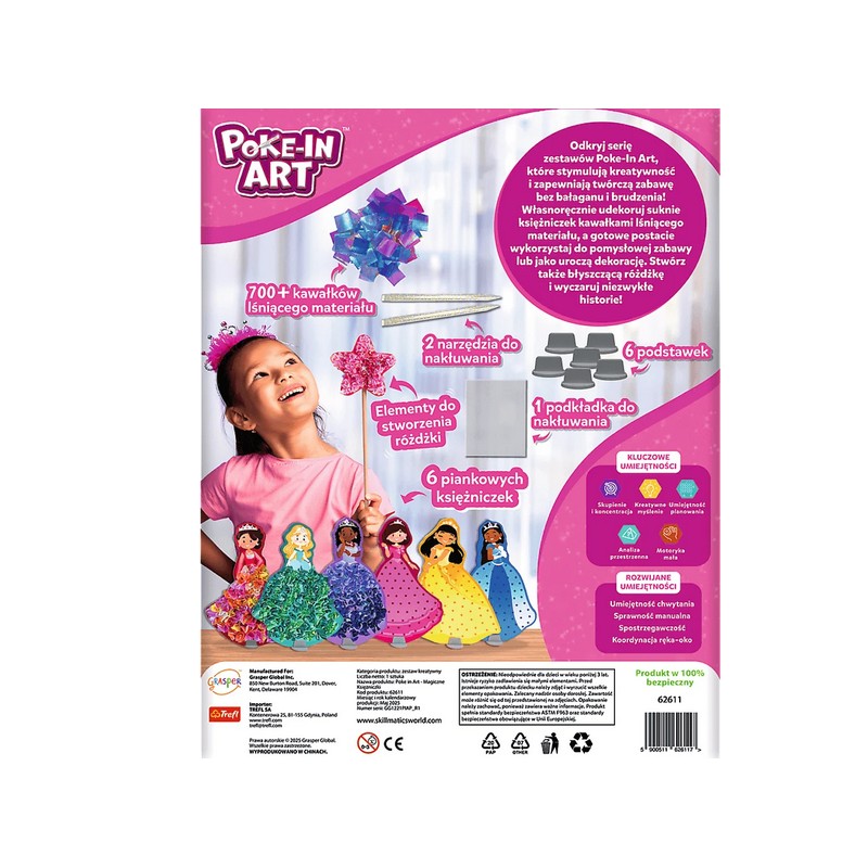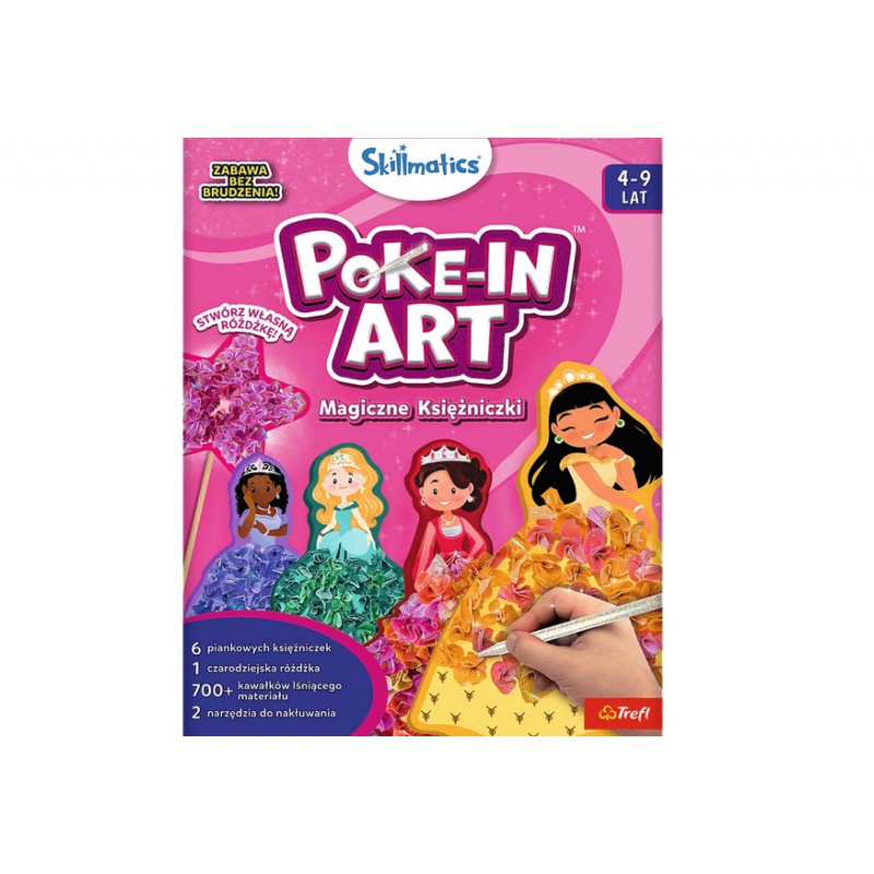 Zestaw nie wymaga kleju ani nożyczek, dzięki czemu cała twórczość przebiega czysto i bezpiecznie, a duża liczba elementów zapewnia długie godziny kreatywnej zabawy. Poke-In Art – Księżniczki to nie tylko świetna rozrywka, ale także okazja do rozwijania małej motoryki, koncentracji i planowania. To idealny prezent dla małych artystów, którzy kochają blask, kolory i magiczne historie.