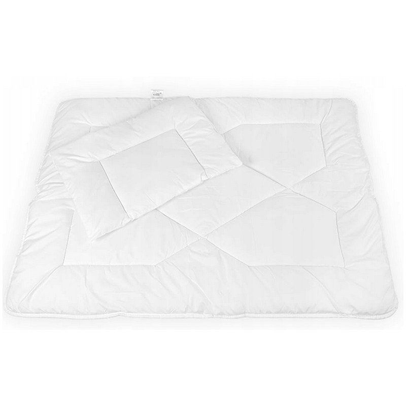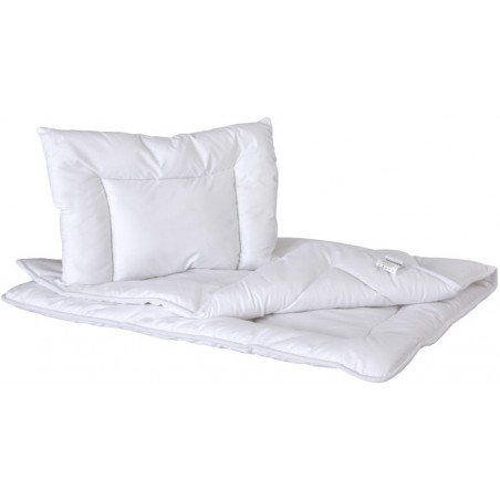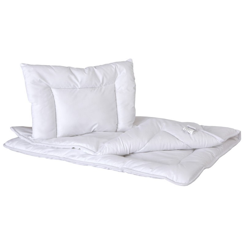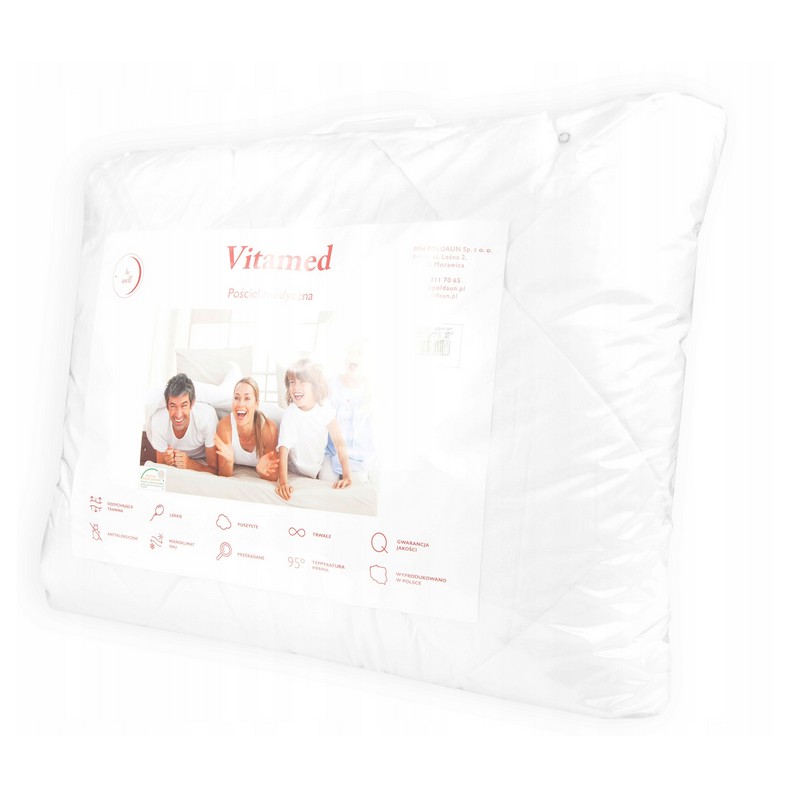 Kołdra i poduszka medyczna VITAMED od Poldaun dla maluszka została przygotowana razem z dermatologami. Komplet jest w pełni antyalergiczny z poduszką pod główkę z przeszyciem, które zabezpiecza wypełnienie przed przemieszczaniem. Najbardziej optymalna wysokość podusi zaprojektowana została z zaleceniami neonatologów oraz pediatrów. Wykonana bardzo starannie w białym poszyciu z miękkiej i przyjemnej mikrofazy, wypełniona granulatem silikonowym FOLLBALL, który umożliwia częste pranie w temperaturze 95 stopni. Kołderka jest lekka i nie ogranicza ruchów śpiącego dziecka. Tkanina wierzchnia posiada Certyfikat Oeko-Tex Standard 100 co oznacza, że została przebadana i nie zawiera substancji szkodliwych dla małego śpioszka oraz substancji powodujących alergie.
