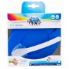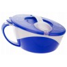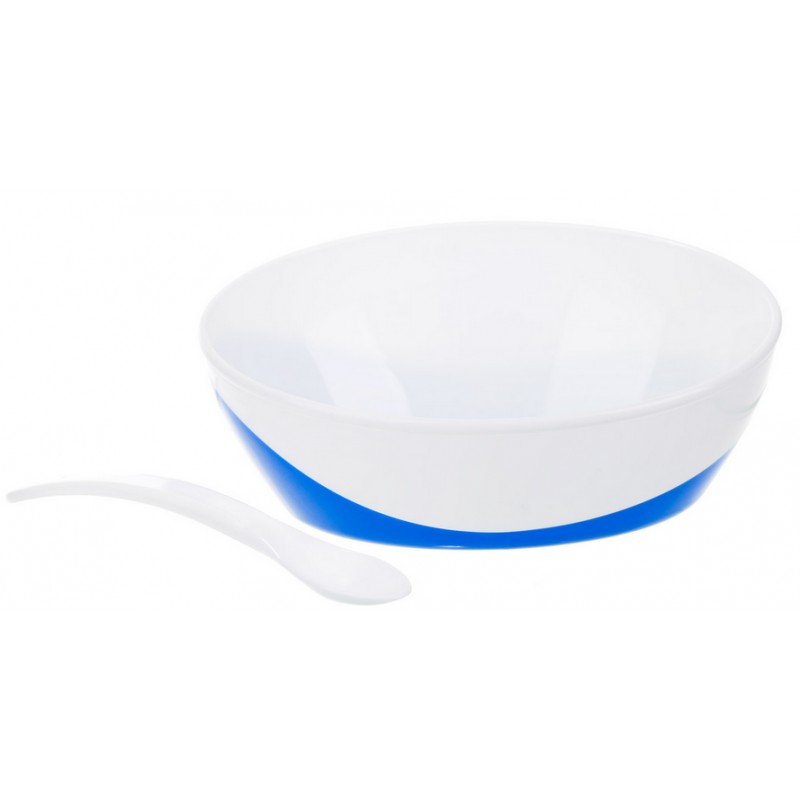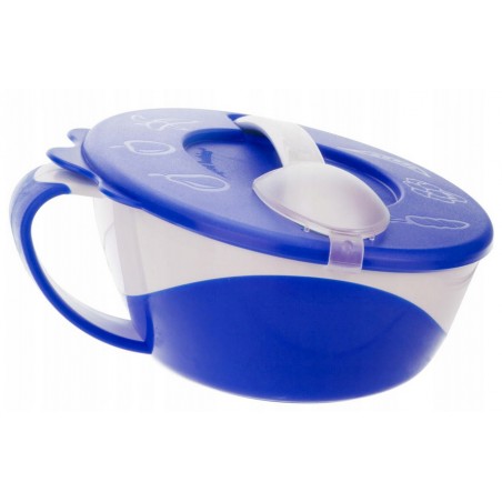 Miseczka z pokrywką wykonana z nietłukącego się plastiku sprawdzi się zarówno w domu, jak i na spacerze. Ucho, brzegi i spód naczynia pokryte są gumą, dzięki czemu miska nie ślizga się w rękach ani na stole. Asymetryczny kształt ułatwia nabieranie jedzenia łyżeczką. Miskę można używać w kuchence mikrofalowej i myć w zmywarce. Dostępna w zestawie z łyżeczką.