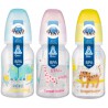 Butelka wąska wykonana z bezpiecznego polipropylenu. Jest lekka, przejrzysta, o wyprofilowanym kształcie i z przejrzystą skalą. Umożliwia łączenie karmienia piersią i butelką. Posiada okrągły smoczek silikonowy o przepływie 0m+.