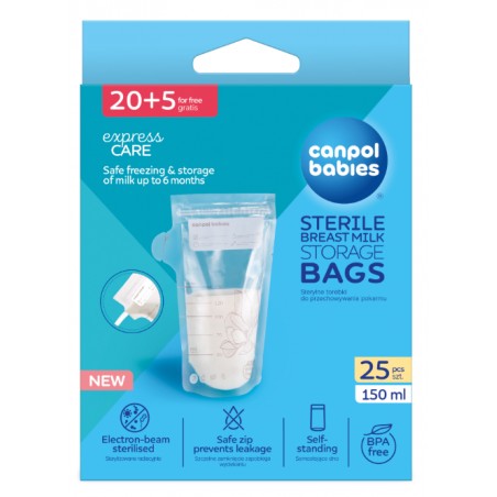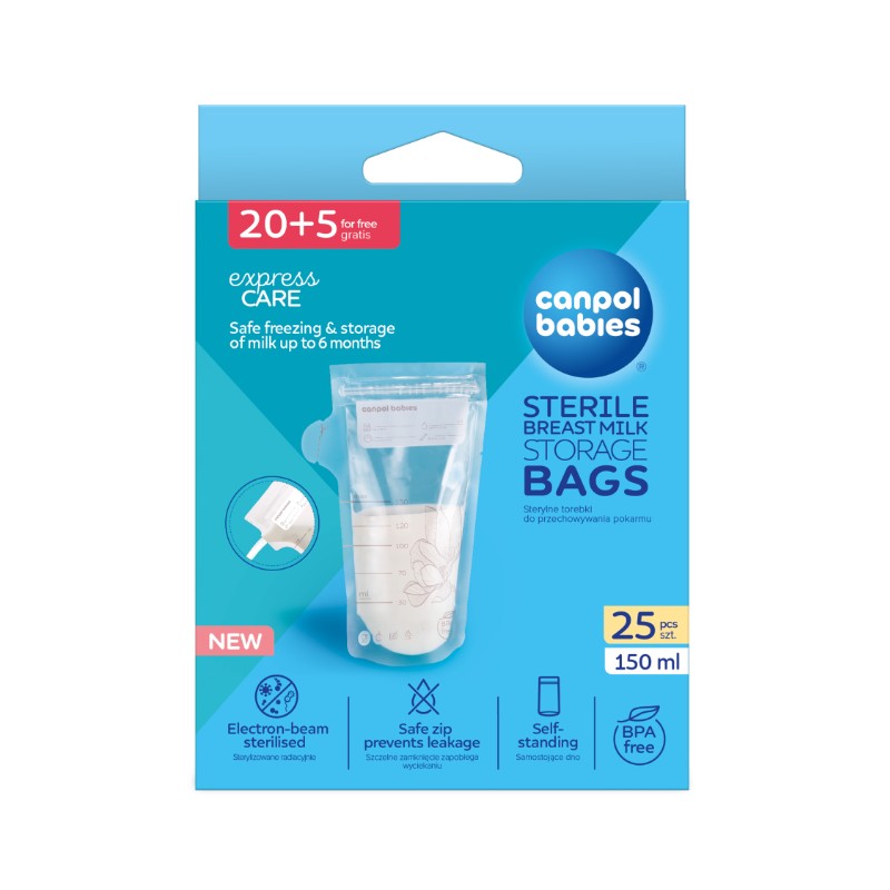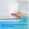 Praktyczne torebki do długotrwałego przechowywania pokarmu w lodówce lub zamrażarce. Konstrukcja woreczka ułatwia postawienie go w pozycji pionowej bez ryzyka rozlania. Każdą torebkę poddano dokładnej sterylizacji, co zapewnia utrzymanie wysokiej jakości pokarmu. W zestawie są samoprzylepne etykiety, na których można zapisać termin przydatności mleka. Woreczki wykonano z wysokiej jakości materiału przeznaczonego do kontaktu z żywnością. W opakowaniu znajduje się 20 torebek o pojemności 150ml.