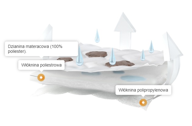 - składa się z dwóch osobnych warstw: trójwarstwowego pokrowca (dzianina materacowa) oraz puszystej włókniny poliestrowej wraz z z płaską polipropylenową