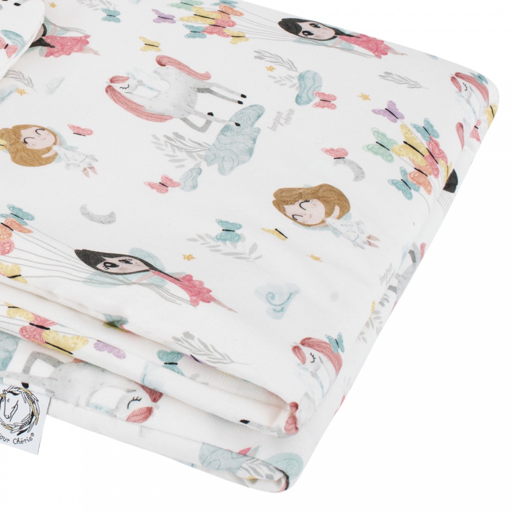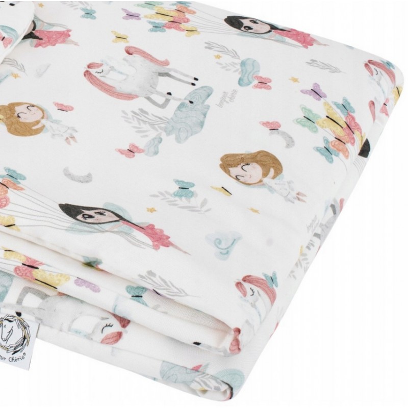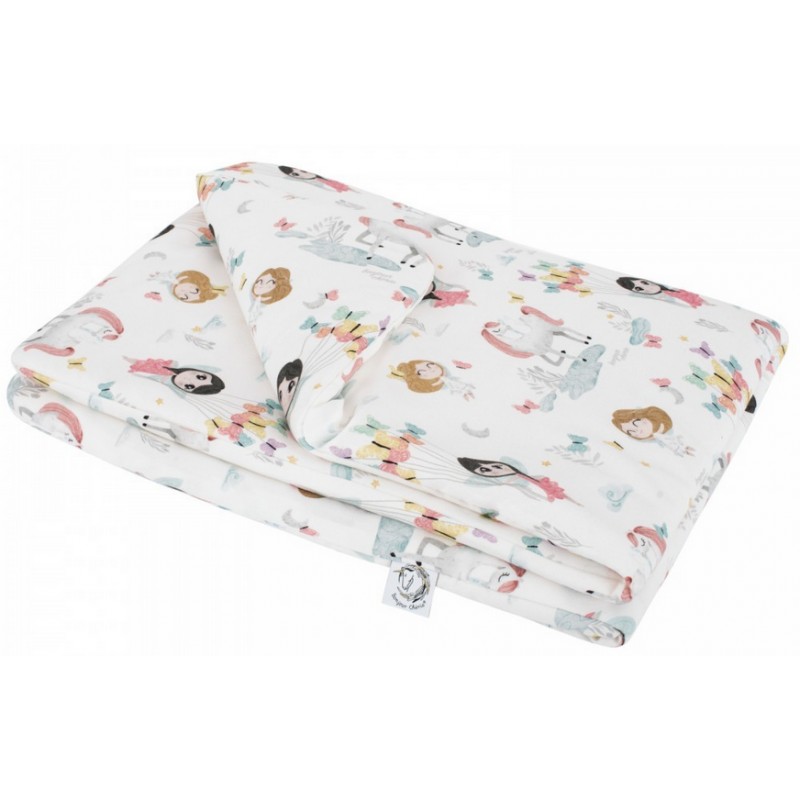 Środek kołderki wypełniony jest antyalergiczną włókniną wysokopuszystą silikonową. Zapewnia ona dziecku ciepło oraz wygodę podczas użytkowania. Kołderka idealnie sprawdza się od pierwszych dni życia, do łóżeczka, na popołudniową drzemkę, do wózka, nosidełka, a także jako ulubiona kołderka na różnego rodzaju wyjazdy lub jako mięciutka mata dla maluszka.