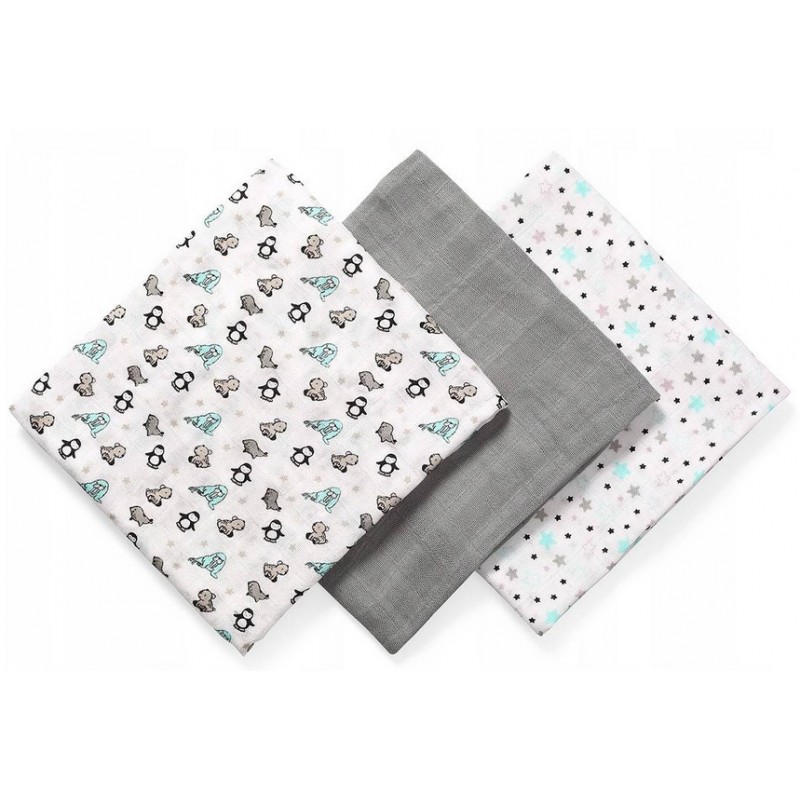 - Zestaw zawiera 3 szt. pieluszek: 2 szt. są zdobione kolorowymi nadrukami, trzecia jest barwiona jednolicie