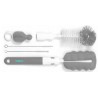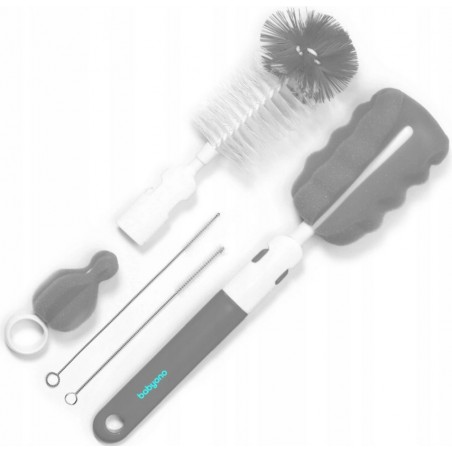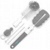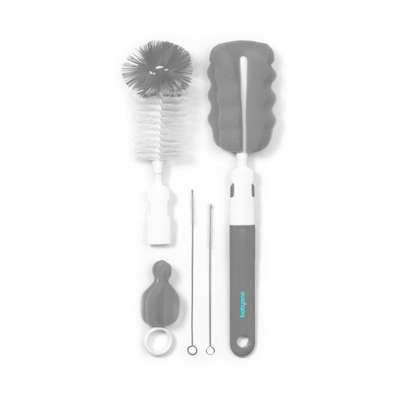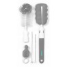 Zestaw szczotek do butelek i smoczków pomaga w ich dokładnym czyszczeniu. Zestaw jest wyposażony w dwie wymienne końcówki do mycia butelek, jedna jest zakończona szczotką z miękką włosiem druga elastyczną gąbką, końcówki można dowolnie zamieniać. Zestaw zawiera dodatkowo gąbkę do czyszczenia smoczków. Szczotka posiada otwór do zawieszenia w celu osuszenia przed kolejnym użyciem. Szczotki docierają do trudno dostępnych miejsc, a wygodne rączki zapewniają stabilny uchwyt. Szczotki wykonane są z trwałych i bezpiecznych materiałów, nie zawierających Bisfenolu A.