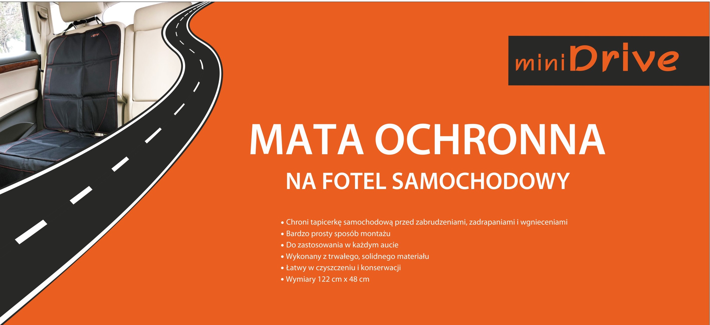 Mata ochronna na fotel samochodowy miniDrive jest praktycznym i cennym dodatkiem do wyposażenia samochodu. Zwiększa estetykę wnętrza, dzięki czemu podróż autem jest bardziej komfortowa i przyjemna. Uniwersalna, jednoczęściowa mata ochrania zarówno siedzisko, jak i oparcie kanapy samochodowej. Zmniejsza do minimum ścieranie się tkaniny czy ekoskóry. Minimalizuje także niechciane wgłębienia powstałe od ciężaru fotelika i dziecka. Zabezpiecza przed plamami, rozlanymi płynami, resztkami jedzenia, śladami małych rączek.