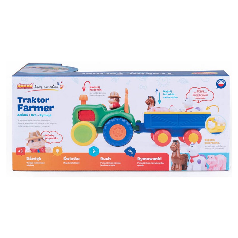 Traktor Farmera to interaktywna zabawka firmy Dumel, która samodzielnie jeździ wydając realistyczne odgłosy zwierząt gospodarczych. W traktorze zapalają się światełka natomiast farmer śpiewa wesoła piosenkę.