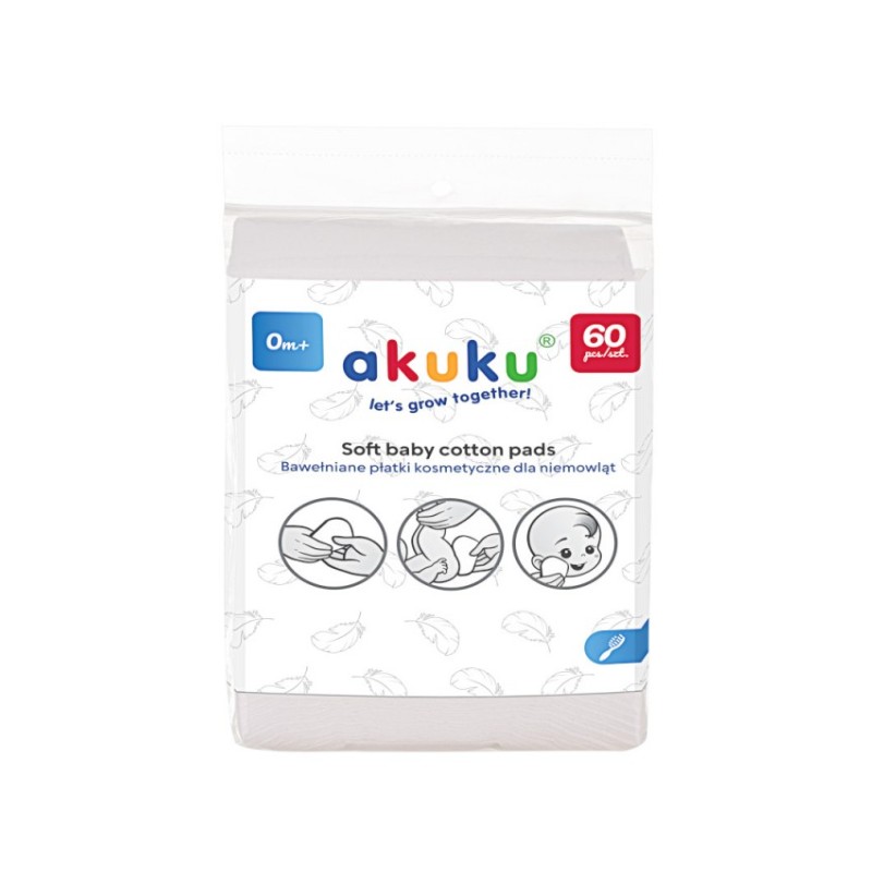 Bawełnianie płatki kosmetyczne dla niemowląt marki „akuku” są bardzo miękkie i delikatne, idealne dla wrażliwej skóry dziecka. Do codziennego stosowania w pielęgnacji przy użyciu oliwki, kremu, wody czy pudru. Płatki kosmetyczne są bezzapachowe, wyprodukowane specjalnie dla najmłodszych dzieci, zachowując najwyższe standardy, aby nie podrażniały i nie uczulały niezwykle delikatnej skóry. Są bezpieczne i wygodne w użytkowaniu.