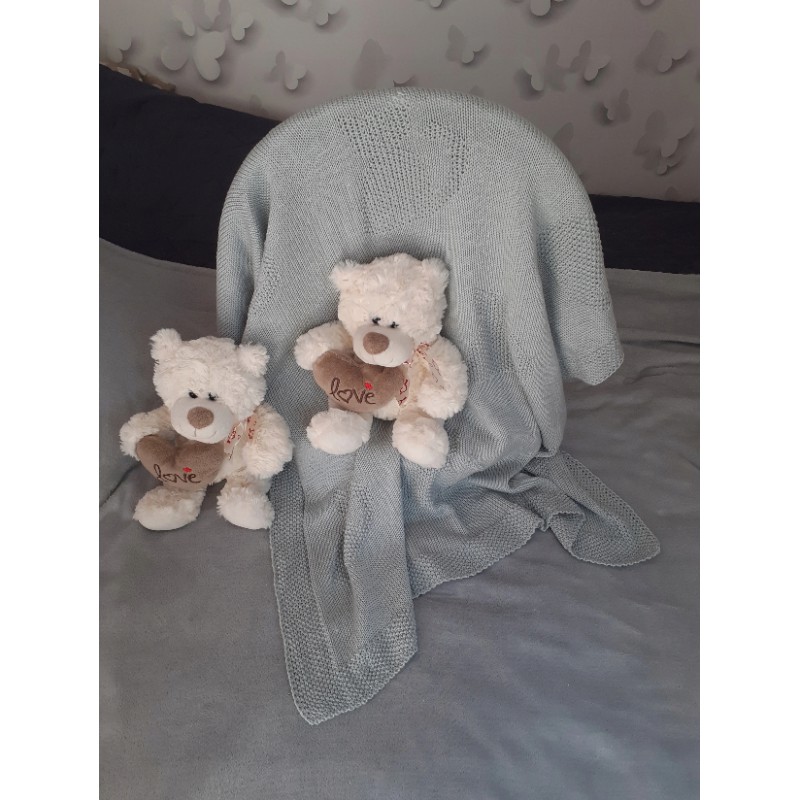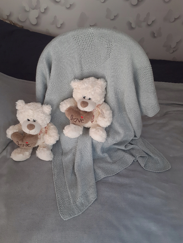 Na całości wyrobu występuje wzór siedzącego kotka przepięknie odznaczający się od gładkiej części kocyka. Obrzeża mają ten sam splot przędzy, którym wykonany jest kotek.
