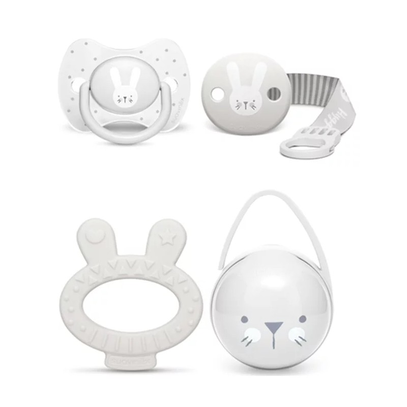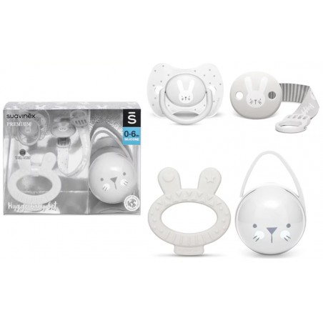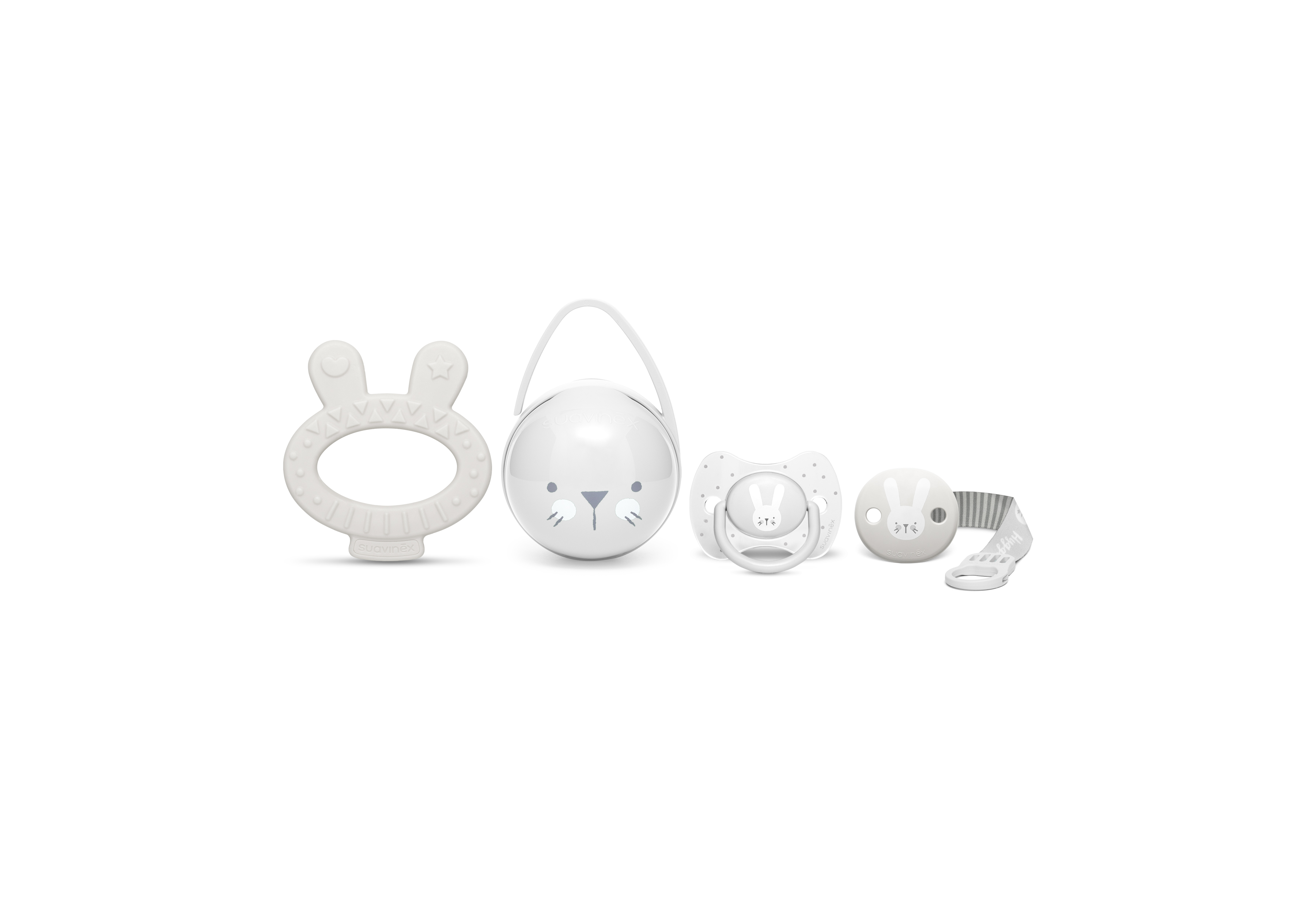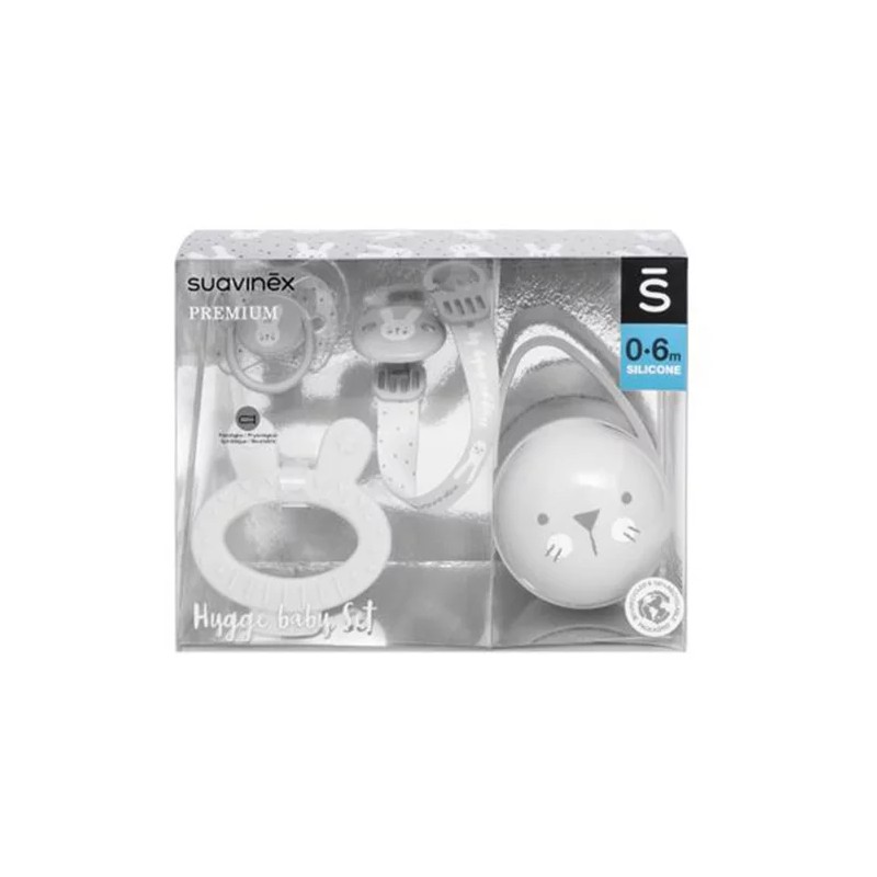 Zestaw podarunkowy Hygge od Suavinex składa się z gryzaczka, smoczka, klipsa do smoczka oraz podwójnego opakowania na smoczki. Zestaw idealnie się sprawdzi jako zakup pierwszych produktów bądź na prezent dla przyszłych rodziców.