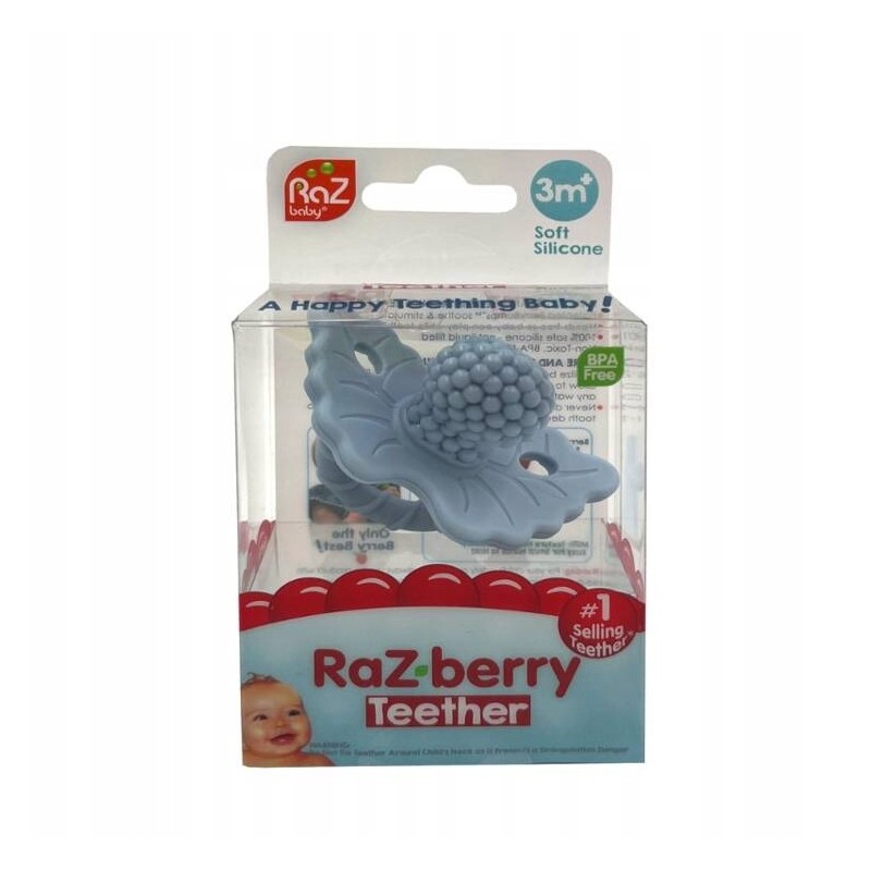 Gryzak RaZ Baby w kształcie Błękitnej Jeżyny zalecany jest niemowlętom od 3 miesiąca życia. Jest on idealną metodą łagodzącą ból spowodowany ząbkowaniem. Pokryty wypustkami owoc maliny zapewni kojący masaż małym dziąsełkom. Kształt i kolor gryzaka, poza ukojeniem bólu, będzie zachęcał maluszka do zapoznania się ze środowiskiem i rzeczami go otaczającymi. Gryzak można schłodzić w lodówce, dzięki temu zimno ukoi bolące i wrażliwe dziąsełka dziecka. Wykonany jest w 100% z silikonu.