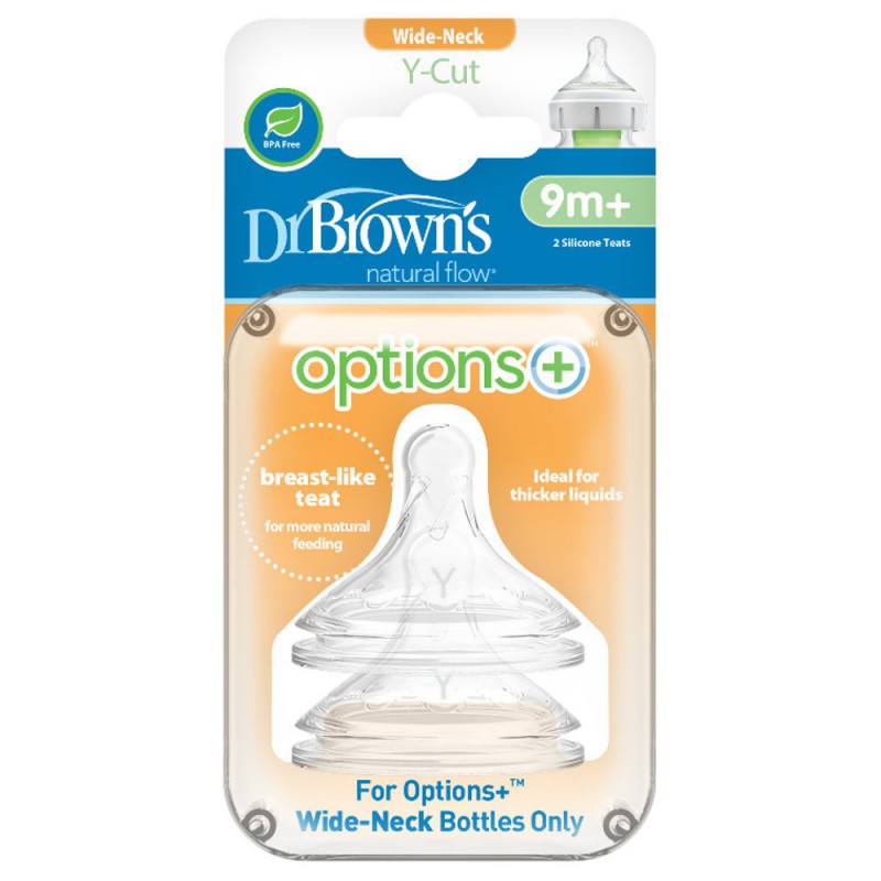 Smoczek Dr Brown's z szeroką szyjką Poziom Y przeznaczony jest do butelki OPTIONS + do kaszek i gęstych soków dla dzieci od 9 miesiąca życia. Smoczek w połączeniu z systemem antykolkowym powoduje bezciśnieniowe karmienie zmniejszając występowanie kolek, odbijania oraz gazów.