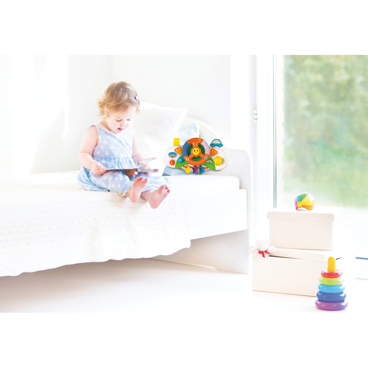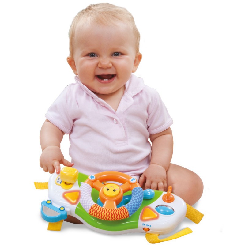 Zabawka naśladuje prawdziwe auto. Jest tu ruchoma kierownica z działającym klaksonem, a na niej 2 dodatkowe przyciski z dźwiękami i melodyjkami. Aby włączyć zabawkę, należy przekręcić kluczyk w stacyjce. Przesuwając dźwignię zmiany biegów, dziecko ćwiczy sprawność dłoni. Przełącznik kierunkowskazów to doskonałe ćwiczenie rozpoznawania strony lewej i prawej (gdy przesuniemy dźwignię do góry – miga lewy migacz, a kiedy do dołu – miga prawy). W bezpiecznym lusterku można zobaczyć, co dzieje się z tyłu. Dodatkowo dziecko może ćwiczyć paluszki, kręcąc kolorowym walcem lub przesuwając plastikowy krążek, gwiazdkę albo trójkąt. Powierzchnia tych elementów ma różnorodne faktury, co dodatkowo stymuluje zmysł dotyku. Część kierownicy pokryta jest materiałem, co ma znaczenie ze względu na rozwój sensoryczny dziecka.