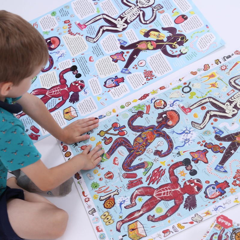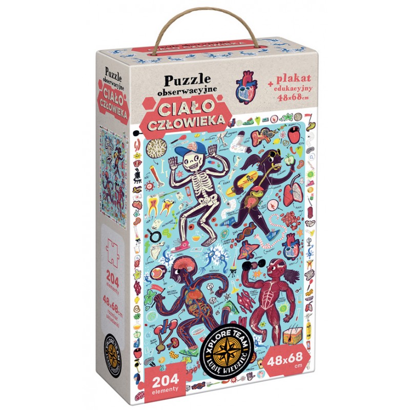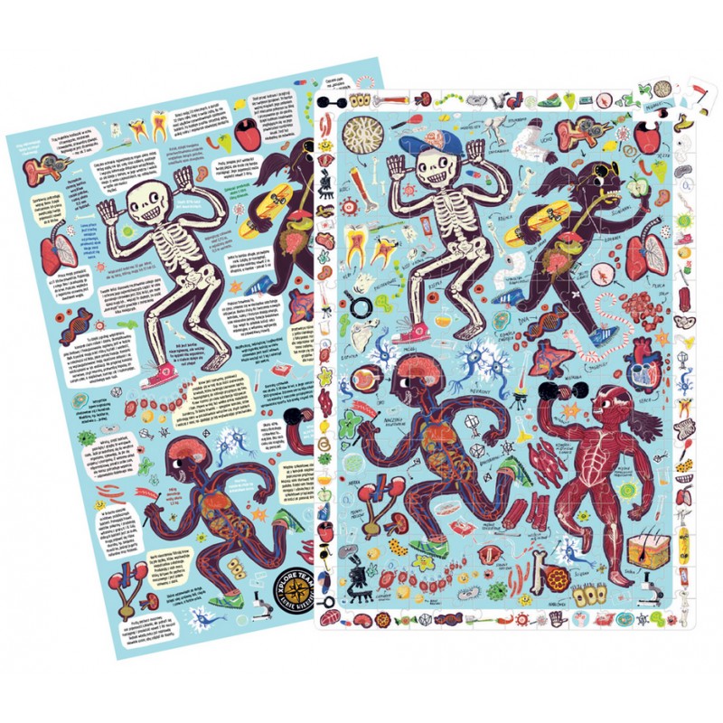 Zobaczcie, jak jest zbudowane i jak działa ludzkie ciało. Edukacyjne 204-elementowe puzzle w pełen humoru sposób przedstawiają złożoność ludzkiego organizmu. Na ramce układanki umieściliśmy mnóstwo szczegółów do wyszukania na ilustracji, aby rozwijająca zabawa trwała jeszcze dłużej. Do zestawu dołączyliśmy plakat edukacyjny.