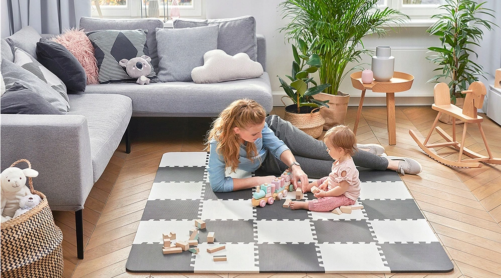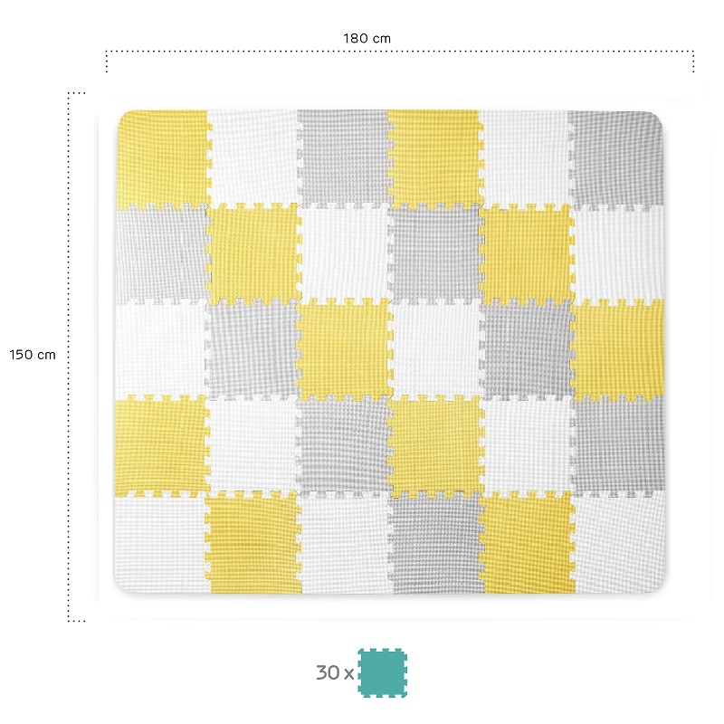 LUNO zawiera aż 30 elementów o łącznej powierzchni 150 x 180 cm, co umożliwia dopasowanie do każdej przestrzeni, a nawet zastąpienie puzzlami dywanu. Dzięki zastosowanym kolorom masz pewność, że mata będzie świetnie się komponować z Twoim mieszkaniem.