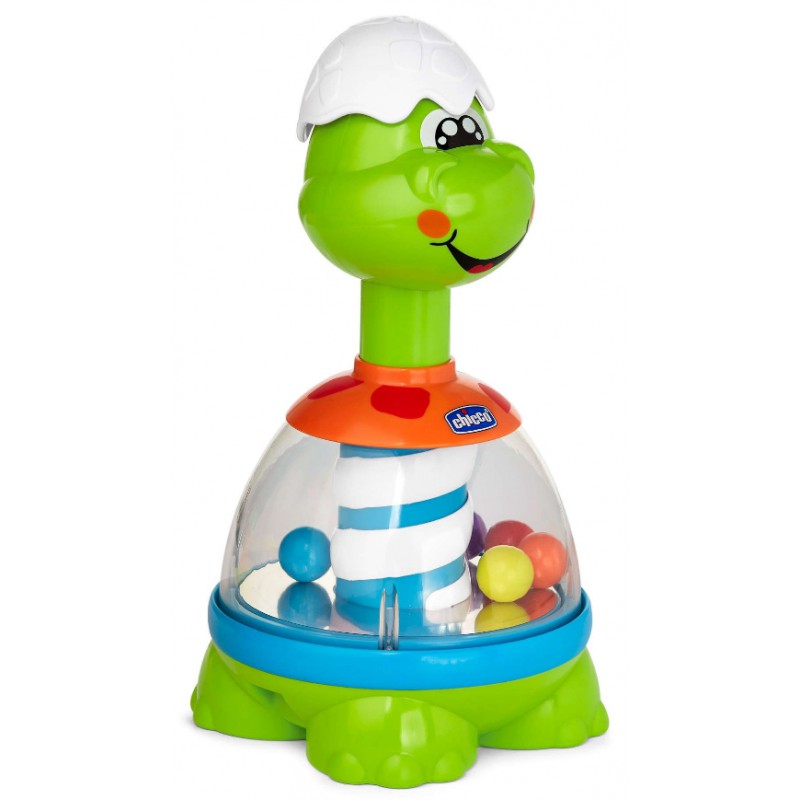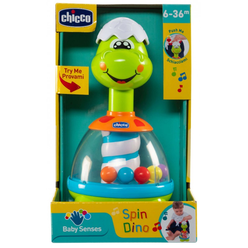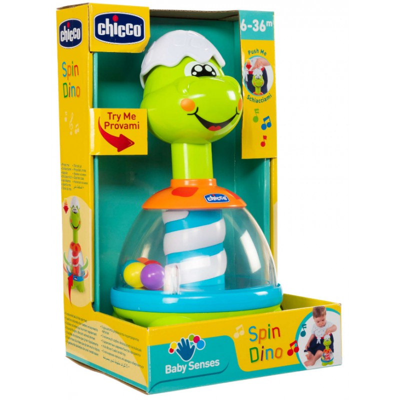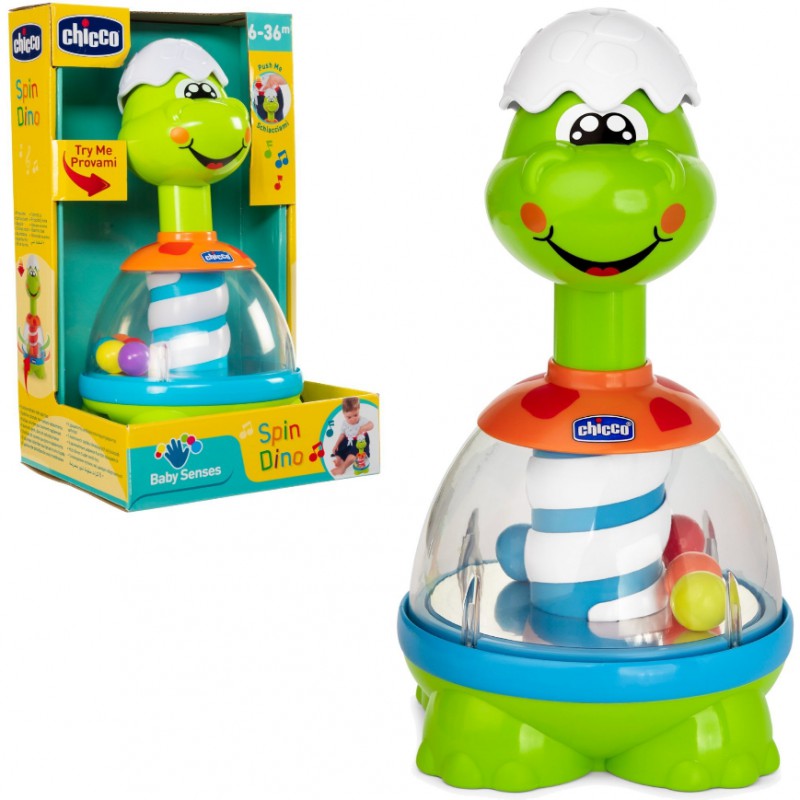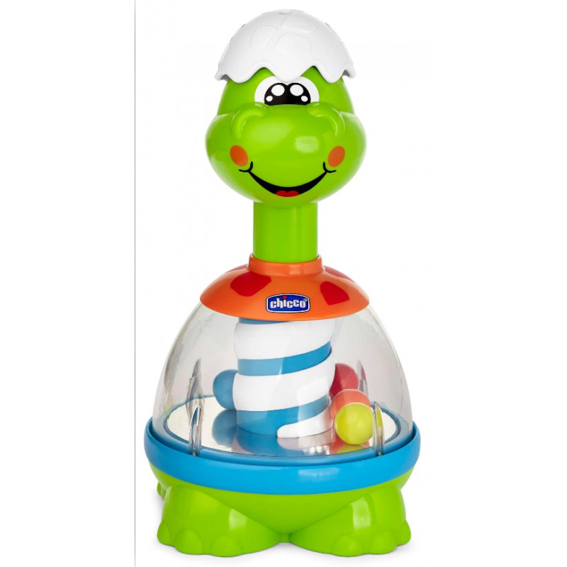 Ulubiona zabawka wszystkich dzieci - bączek - przybrała formę uroczego, uśmiechniętego dinozaura. Dinozaur wygląda, jakby dopiero się wykluł, na głowie ma kawałek skorupki z jaja. Naciśnij ją, aby aktywować melodie i zobaczyć, jak kolorowe kulki zaczynają wirować. Wbudowane w podstawę przezroczystego brzuszka Dino lusterko, optycznie powiela ilość wirujących kuleczek dając jeszcze bardziej intensywny efekt. Oś Dino stanowi biało-niebieski trzon, który podczas ruchu daje efekt podobny do efektu optycznego znanego z barber shopów. Bączek Dino pomaga odkrywać związek przyczynowo-skutkowy, rozwijać koordynację oraz wrażliwość muzyczną dziecka.