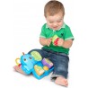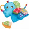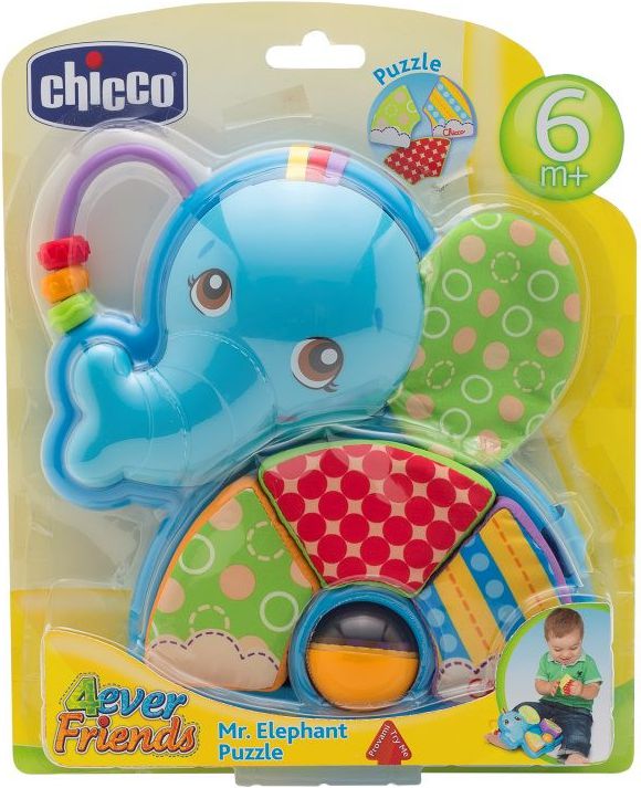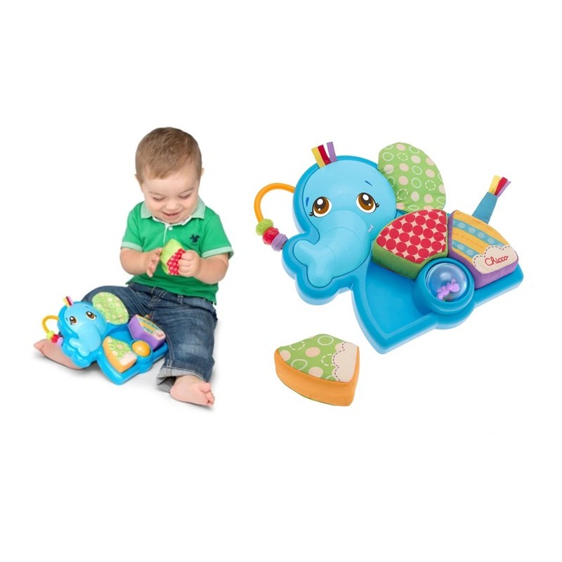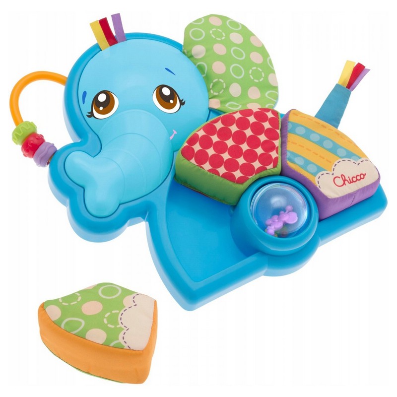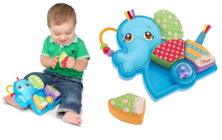 Słonik od Chicco to pierwsze, bardzo proste puzzle: w plastikowy brzuszek zwierzaka trzeba wpasować trzy wielokolorowe elementy. Są one wykonane metodą patchworkową, tj. kilka wzorzystych kawałków tkanin zostało ze sobą połączonych, wypchanych i uformowanych w odpowiedni kształt. Wykonane z miękkiego materiału elementy zabawki pozwolą dziecku łatwiej je chwycić (są lekkie), ugniatać i ściskać w rączkach. Fragmenty tkanin znajdują się również na ogonku i głowie Słonika, przypominając uwielbiane przez najmłodsze pociechy wystające metki. Jedno z uszek Trąbalskiego, również wykonane z materiału, stymuluje zmysł słuchu i dotyku przyjemnie szeleszcząc. Drugie uszko to poręczny uchwyt z trzema kolorowymi mini-pierścieniami o różnych fakturach. Dzięki temu dziecko bada, rozpoznaje przedmioty oraz poznaje otaczający go świat. Na środku brzuszka Elephanta znajduje się półprzezroczysta kula z grzechoczącymi mini kuleczkami i fioletową myszką. Doskonaląc koordynację ręka-oko maluch nabiera poczucia przestrzeni.