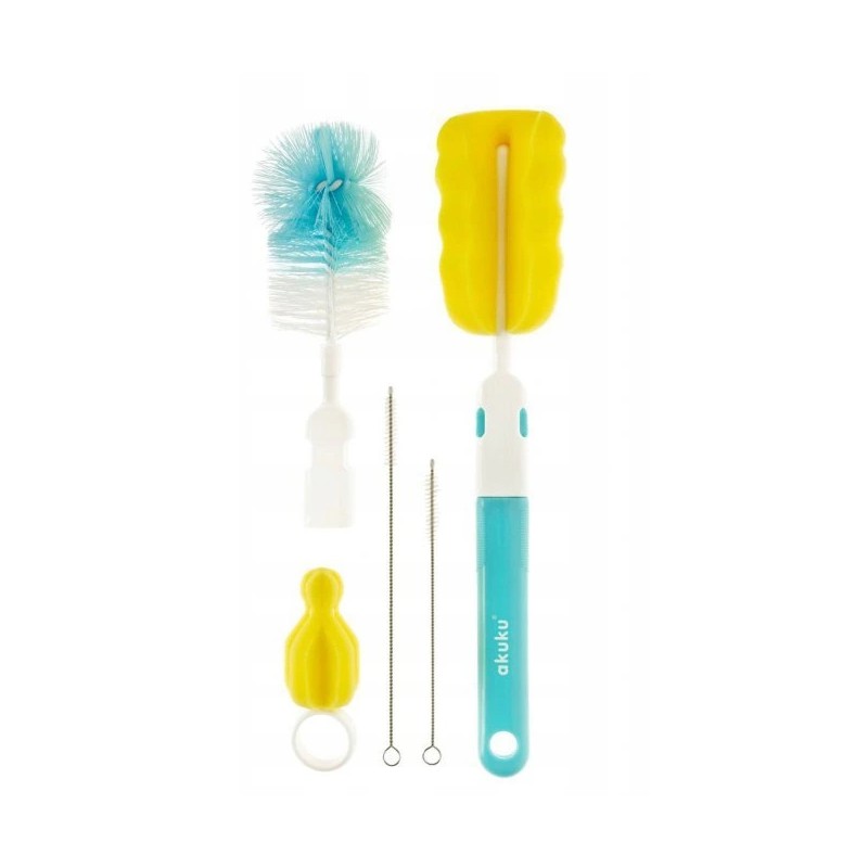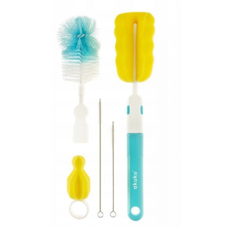 Zestaw szczotek do mycia butelek i smoczków AKUKU z wymienną rączką, z mini gąbką. Idealny zestaw do czyszczenia butelek, smoczków oraz słomek w bidonach. Niezbędnik każdej mamy dla której czystość i higiena jest na pierwszym miejscu.