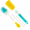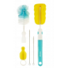Zestaw szczotek do butelek, smoczków i słomek pozwala na precyzyjne usuwanie zabrudzeń w trudno dostępnych miejscach. Wyposażony jest w dwie wymienne końcówki do mycia butelek, gdzie jedna zakończona jest szczotką z miękkim włosiem, a druga wykonana z profilowanej gąbki. Obie końcówki można dowolnie zamieniać. Zestaw zawiera dodatkowo gąbkę do czyszczenia smoczków oraz 2 czyściki do słomek. Każda ze szczotek posiada okrągły otwór do zawieszenia w celu łatwiejszego osuszenia przed kolejnym użyciem. Zestaw wykonany z trwałych i bezpiecznych materiałów, dostępny w dwóch wersjach kolorystycznych: miętowy i niebieski.