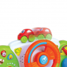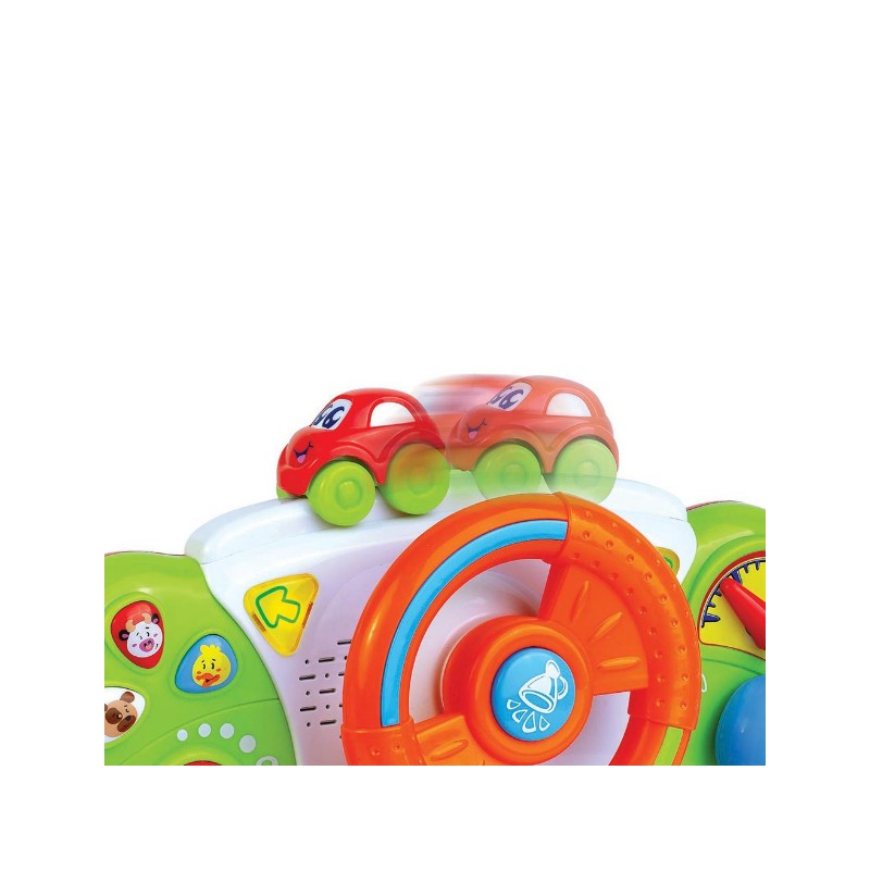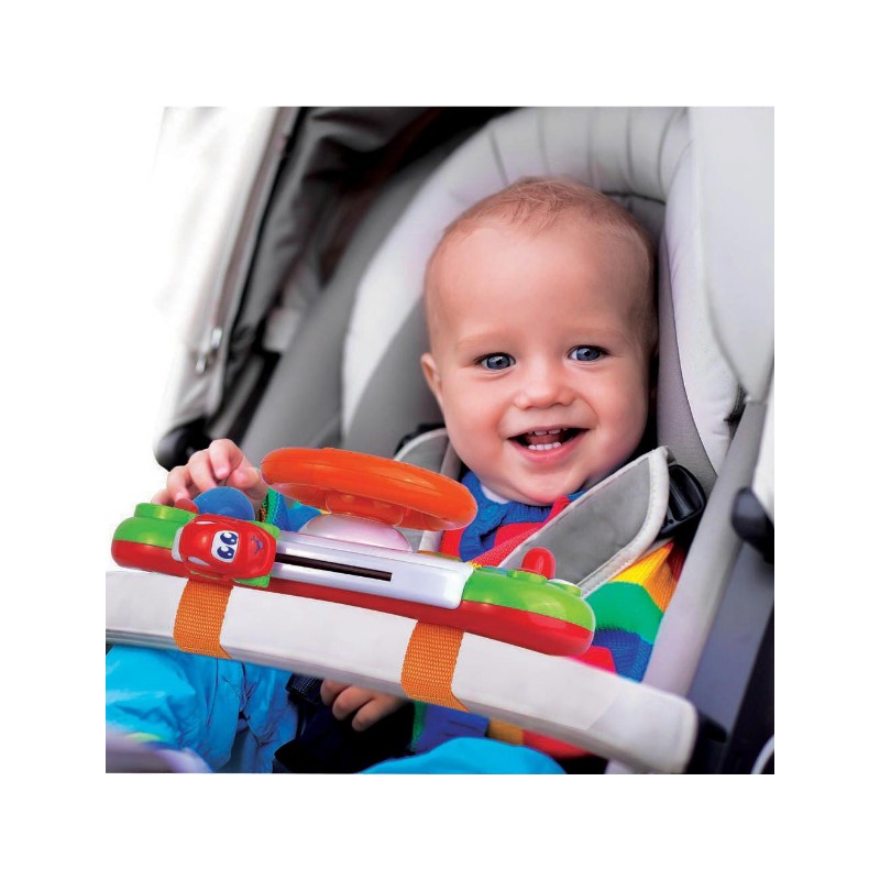 Kręć kierownicą i obserwuj autko jeżdżące na desce rozdzielczej, naciskaj guziczki ze strzałkami, przekręć kluczyk w stacyjce i sprawdź jakie odgłosy wydają zwierzaki. Na środku kierownicy znajduje się klakson, zupełnie jak w prawdziwym samochodzie! Zabawka wyposażona jest w wyłącznik, dzięki czemu bobas może z niej korzystać w każdym miejscu. Panel sterowania posiada z tyłu praktyczne taśmy, więc bez trudu przymocujesz go do dziecięcego wózka.