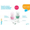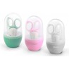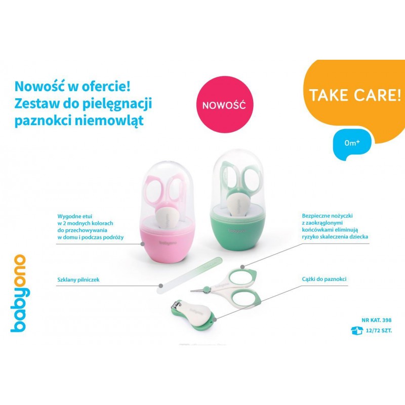 Kompletny zestaw do pielęgnacji paznokci niemowląt. Higieniczne, wykonane ze stali nierdzewnej nożyczki i cążki do obcinania paznokci oraz szklany pilniczek do wygładzania nierówności. Wszystkie elementy zestawu zapakowane są w praktyczne etui, które umożliwia higieniczne przechowywanie oraz przenoszenie.