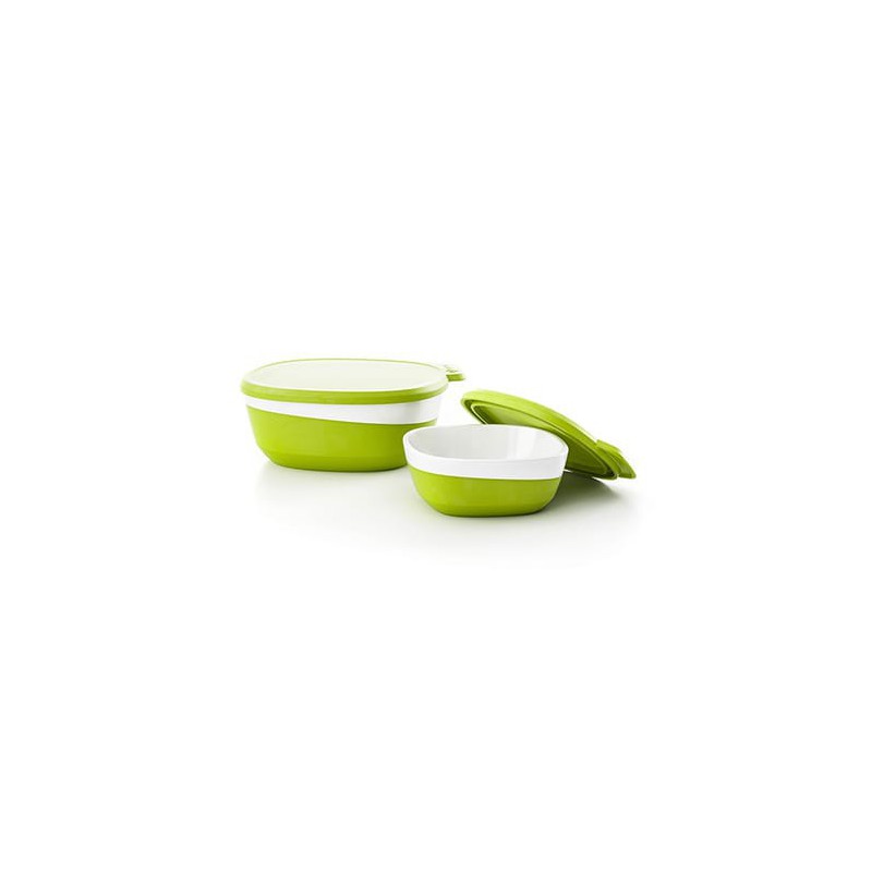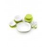 Zestaw startowy składa się z dwóch dużych miseczek i pokrywek, dwóch małych miseczek i pokrywek, widelca i łyżki.