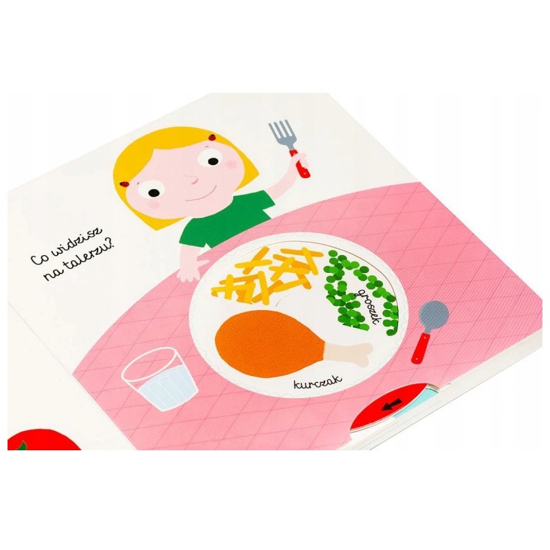 Dzięki książce z ruchomymi elementami „Jedzenie” dziecko pozna nazwy pożywienia – warzyw, owoców, nabiału. Maluch pozna odpowiedzi na pytania m.in. o to który owoc jest żółty oraz co można pić z butelki.