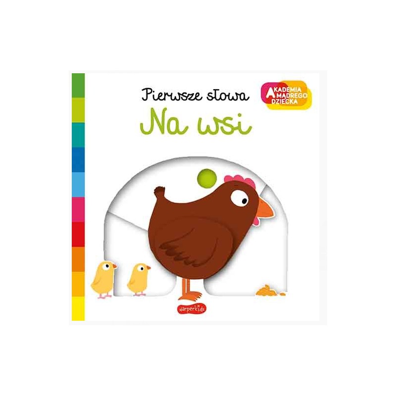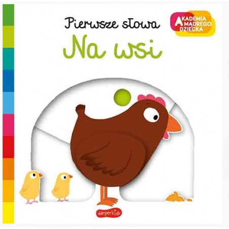 "Na wsi. Akademia mądrego dziecka.Pierwsze słowa” to seria książeczek dla dzieci i rodziców do wspólnego oglądania i czytania. Ruchome elementy, doskonale wspierają rozwój maluchów i rozwijają sprawność manualną. Wystarczy przesunąć, pokręcić, popchnąć kartonowe elementy, by zmienił się obrazek. Wspaniała zabawa dla dzieci, sposób na zaprzyjaźnienie się z książką, a także trening rączki i małej motoryki. Piękne kolorowe ilustracje sprawiają, że dzieci z przyjemnością odkrywają świat wokół siebie i chętnie uczą się nowych słów. Kartonowe, sztywne strony oraz zaokrąglone rogi zapewniają długą i bezpieczną zabawę z książkami.