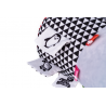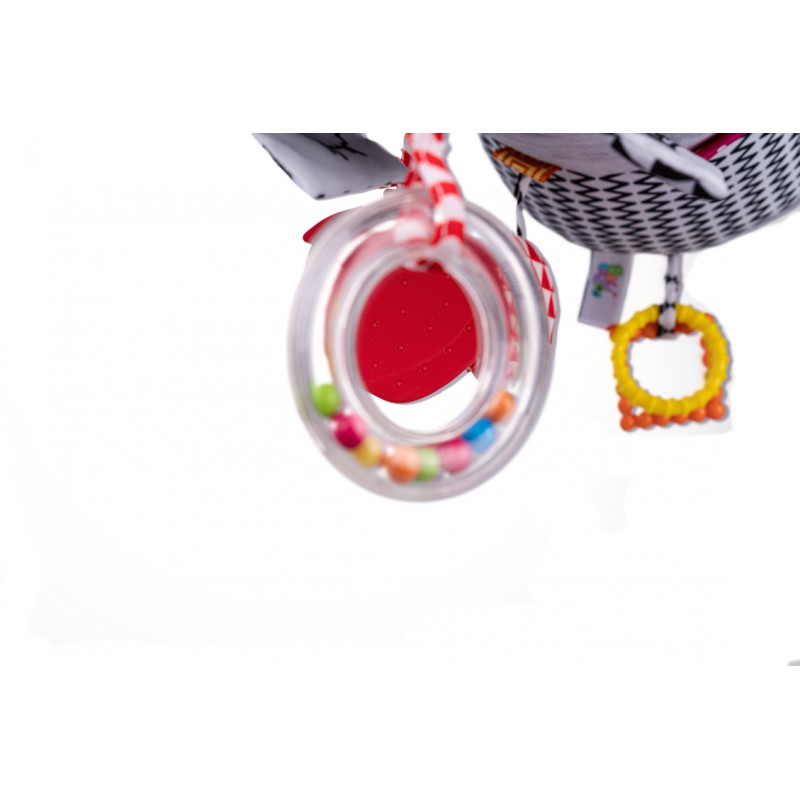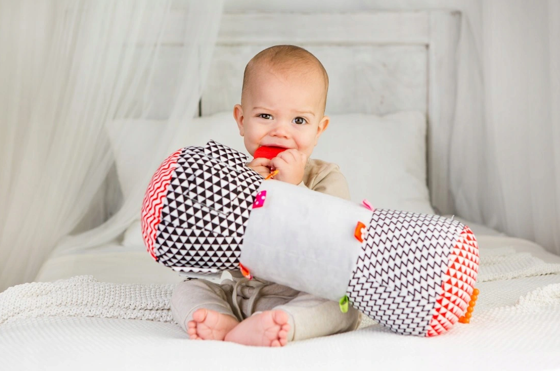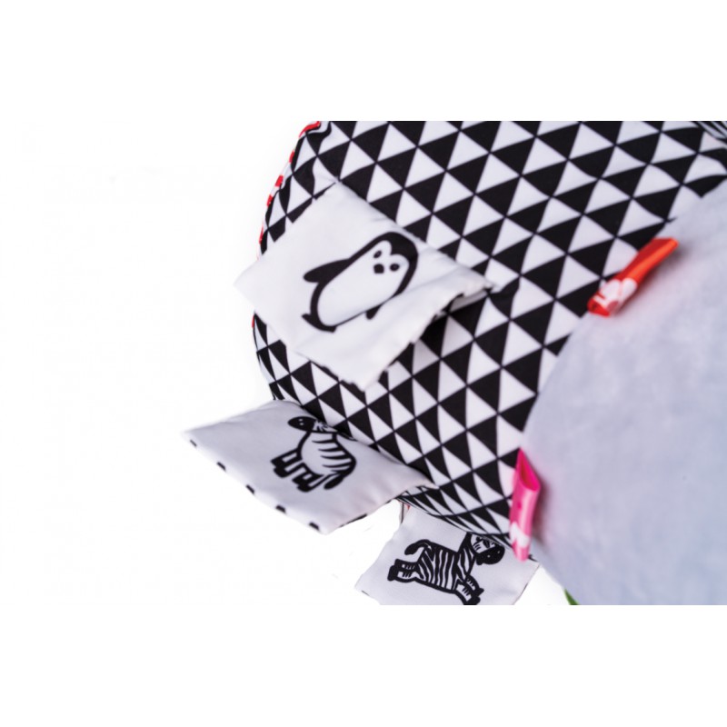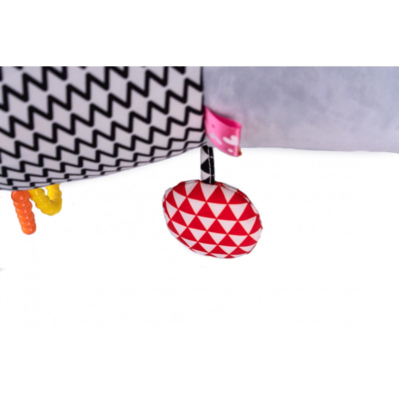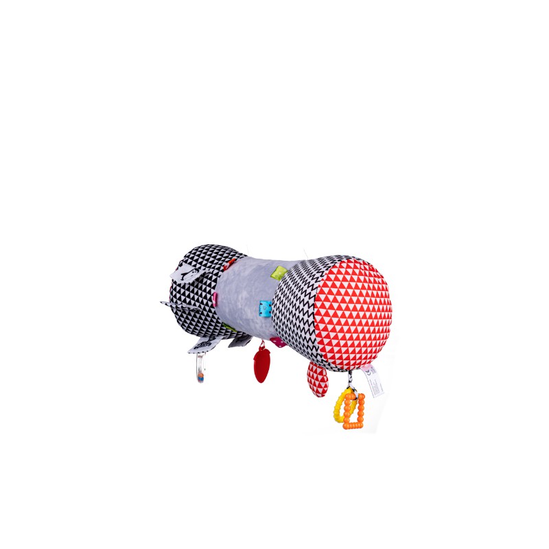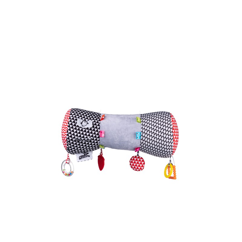 Milutki wałek do wsparcia dziecka leżącego na brzuszku zadba o wygodę malucha, zapewniając mu moc atrakcji! Na małego miłośnika zabawy czeka tu piszczałka, gryzaczki, grzechotka oraz szeleszczące łatki z podobiznami zwierzątek! Wałek wykonany został ze zróżnicowanych materiałów ozdobionych kontrastowymi wzorami, które stymulują zmysły wzroku i dotyku dziecka.